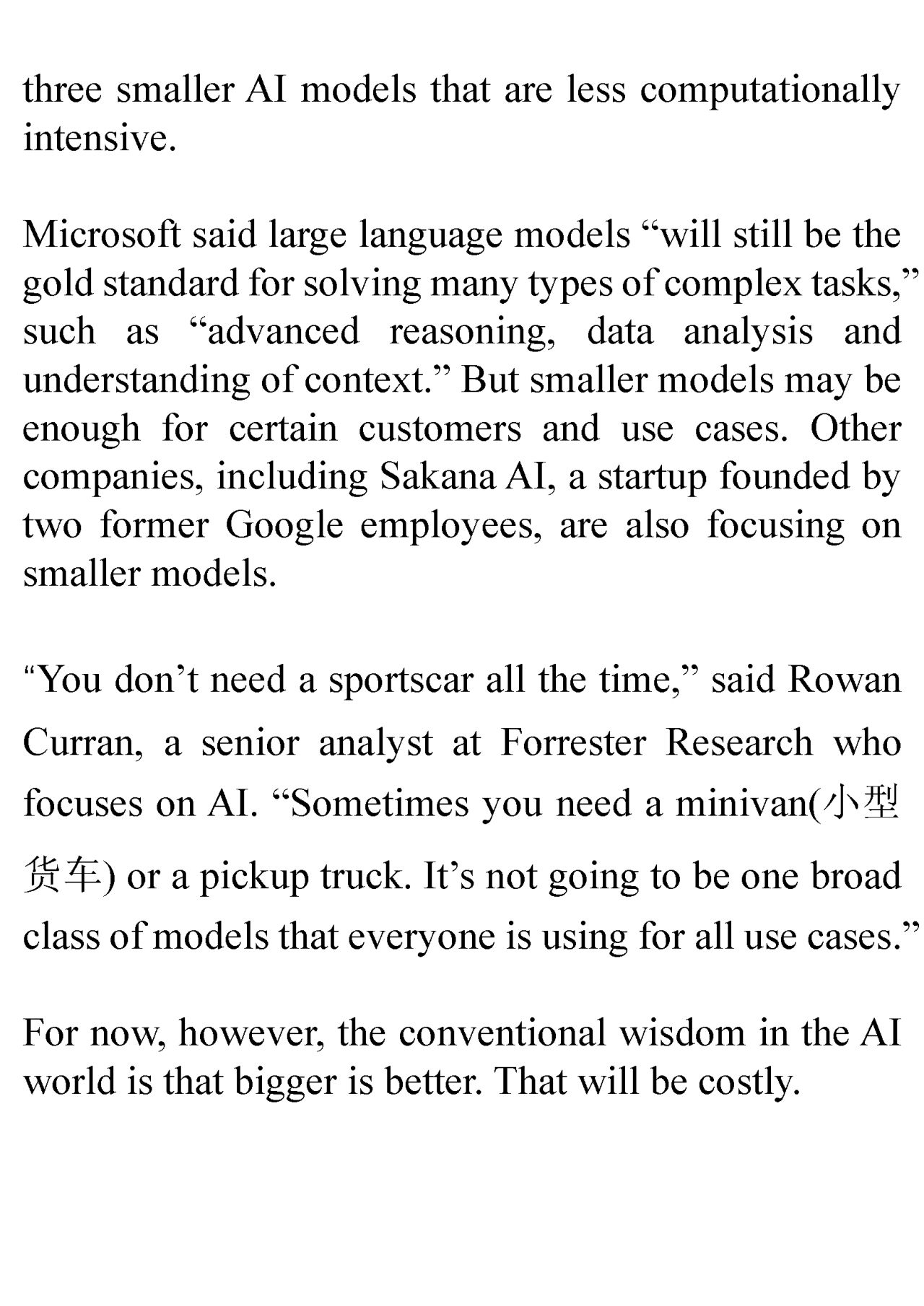 微軟表示,大型語言模型“仍將是解決多種複雜任務的黃金標準,”例如“高級推理、數據分析和理解上下文。”但(較)小模型可能足以滿足某些客戶和用例的需求。其他公司,包括由兩名前谷歌員工創立的創業公司Sakana AI,也正專注於(較)小模型。