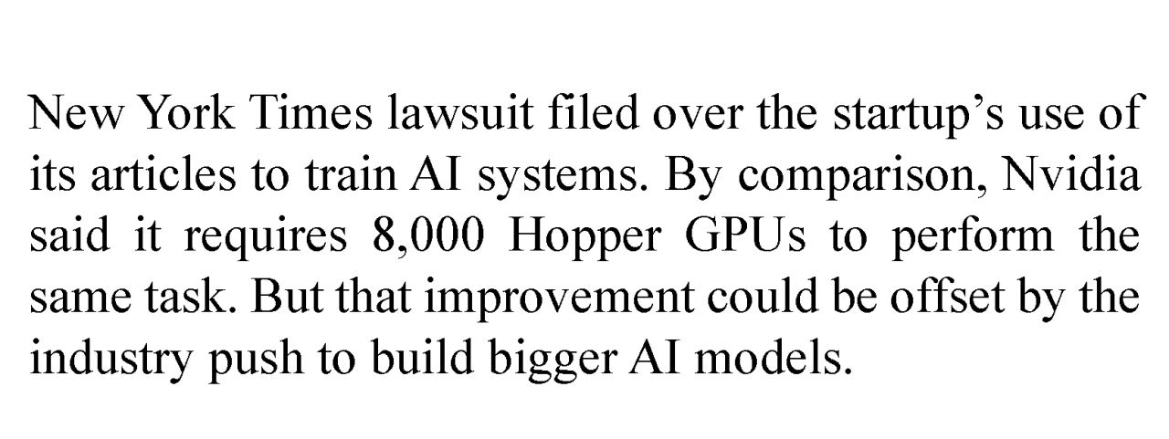 上個月,英偉達發佈了一種名爲Blackwell的新處理器設計,它在處理大型語言模型方面快數倍,並且預計其定價將與包含H100的Hopper系列相似。英偉達表示,大約需要2,000個Blackwell GPU來訓練一個1.8萬億參數的AI模型。根據《紐約時報》就該創業公司使用其文章訓練AI系統提起的訴訟,這是OpenAI GPT-4的估計規模。相比之下,英偉達表示執行相同任務需要8,000個Hopper GPU。但這種改進可能會被行業中構建更大AI模型的推動所抵消。