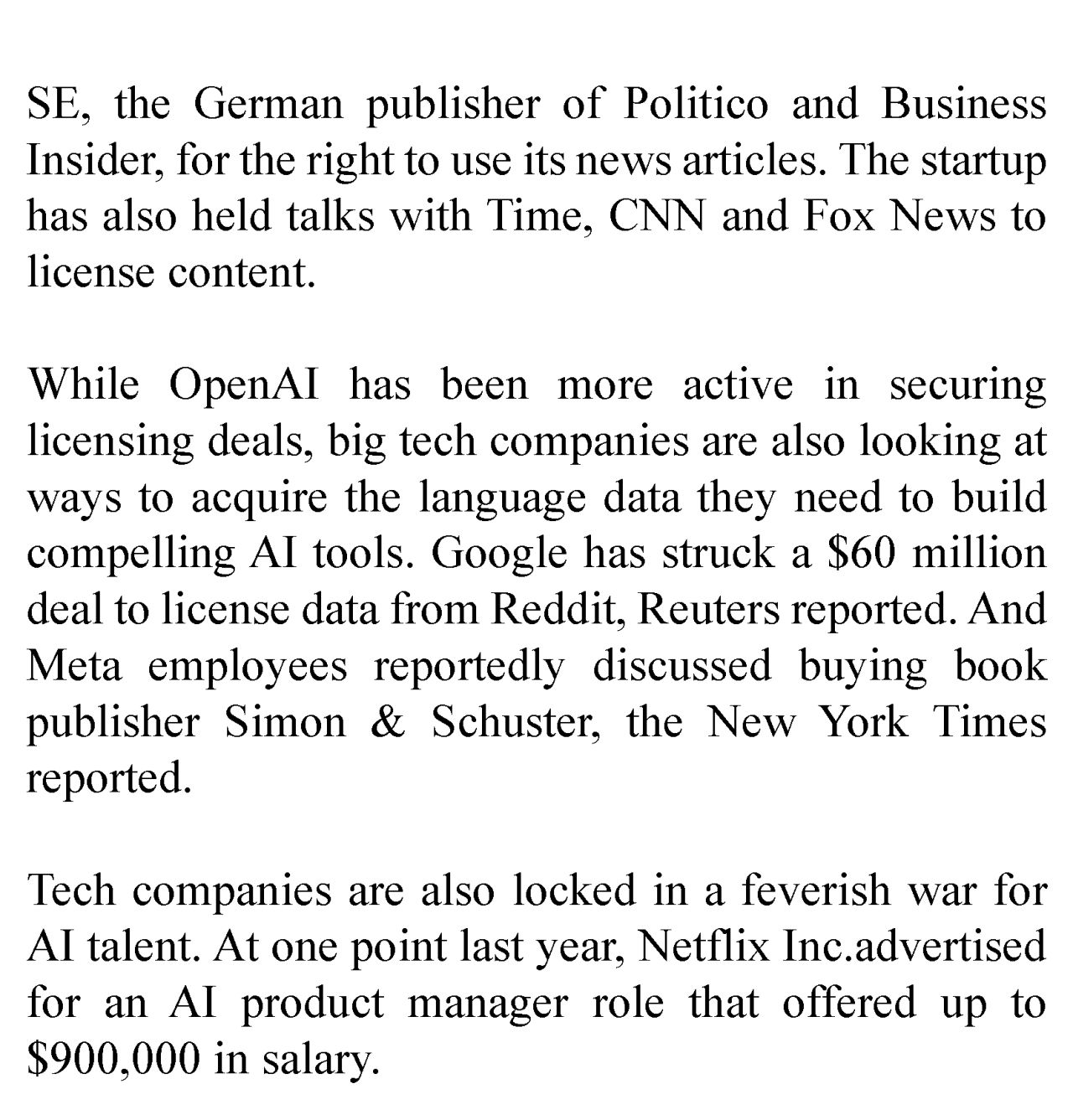 雖然OpenAI在確保(獲取)許可交易方面更爲積極,但大型科技公司也正在尋找方法,以獲取他們構建有吸引力的AI工具所需的語言數據。據路透社報道,谷歌已達成一項價值6000萬美元的協議,以獲取Reddit的數據許可。據《紐約時報》報道,Meta的員工據稱討論了收購圖書出版商Simon & Schuster的事宜。
