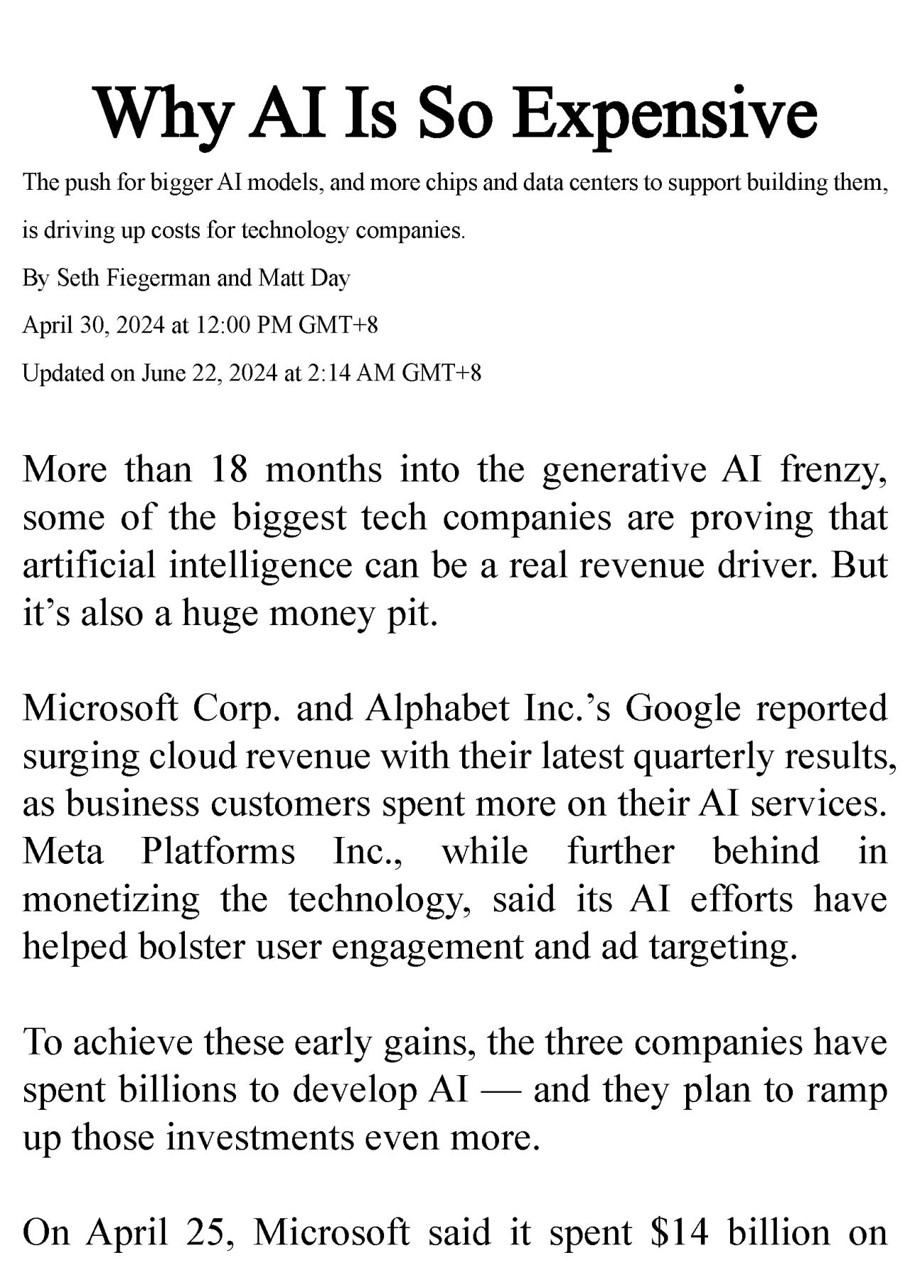 AI不斷上漲的成本讓一些投資者措手不及。特別是Meta的股價,因其支出預測以及慢於預期的銷售增長而大跌。但在科技行業內部,AI成本將會上漲長期以來一直是一條信念。這有兩個關鍵原因:AI模型正變得越來越大、開發成本越來越高,而且全球對AI服務的需求需要建造更多的數據中心來支持它。