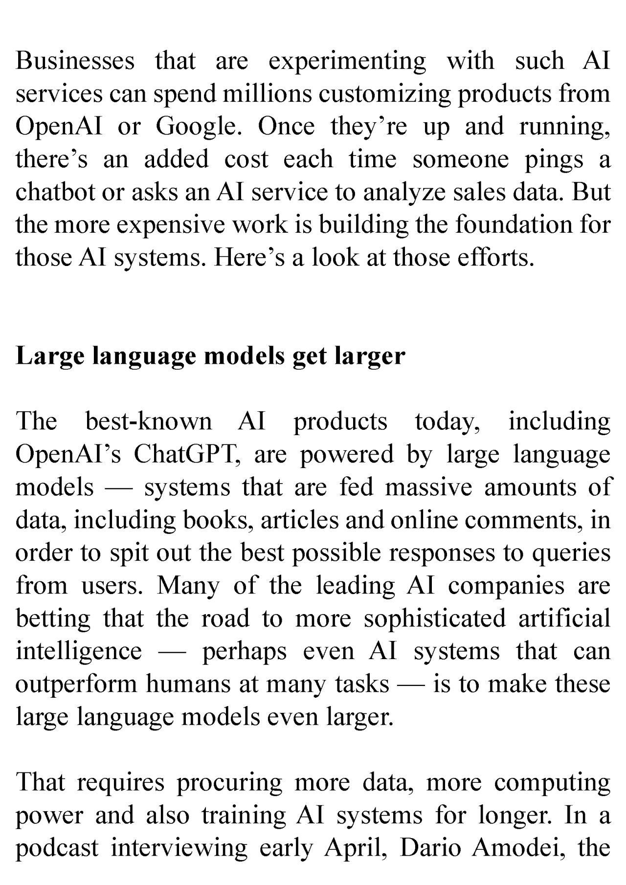 這需要獲取更多數據、更多計算能力,以及更長時間地訓練AI系統。在4月初的一次播客採訪中,OpenAI的競爭對手Anthropic的首席執行官Dario Amodei表示,目前市場上的這批AI模型的訓練成本約爲1億美元。