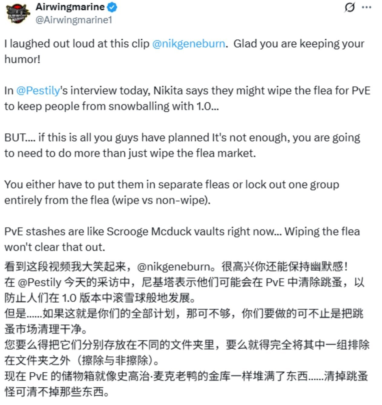 遊戲總監尼基塔·布亞諾夫透露,1.0版本將對PvE模式進行重大平衡調整。爲解決因PvE玩家數月積累物資導致的跳蚤市場經濟失衡問題,官方考慮在1.0版本上線時清空PvE平臺的跳蚤市場數據。