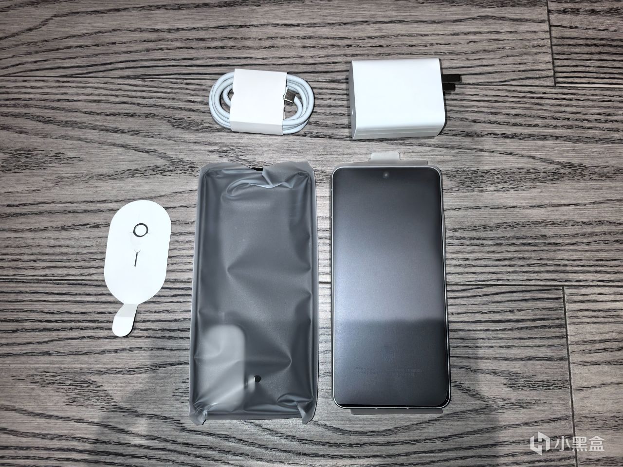 物品並不多:手機本體、官方套殼、充電頭與充電線、SIM卡槽插針。