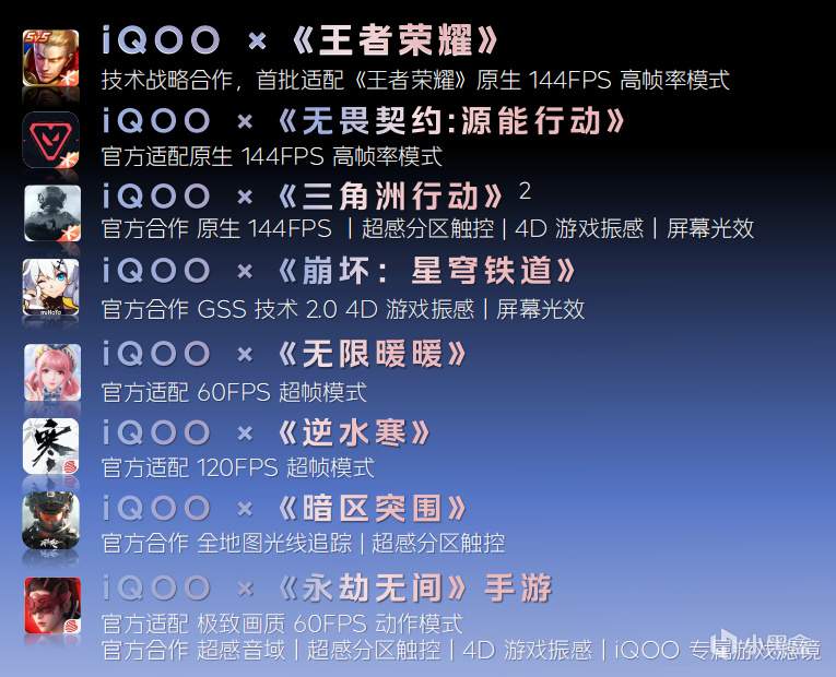 iQOO同多個廠商都有深度的合作,除了上述兩個遊戲外,它還對《無畏契約》、《崩壞:星穹鐵道》、《無限暖暖》、《逆水寒》、《暗區突圍》、《永劫無間》等熱門遊戲提供了官方合作的適配支持,適配110+遊戲超分、140+遊戲超幀和40+遊戲原生144Hz。
