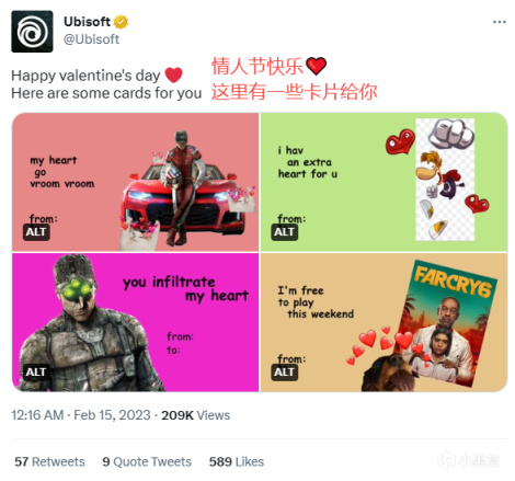 有趣的是,育碧官方推特在昨日發佈了一條推文,在推文中官方祝玩家們情人節快樂,並宣傳了本次的限免活動。