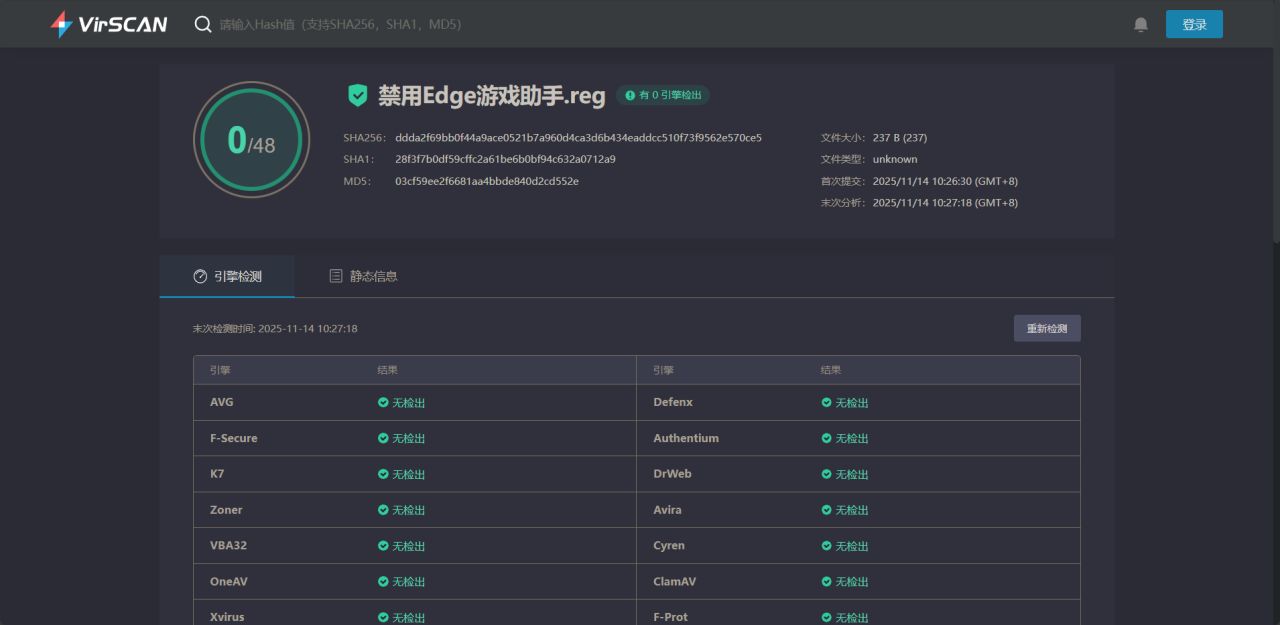 一鍵禁用Edge遊戲助手.reg已經經過VirScan在線病毒查殺,48個殺毒引擎均無檢測出病毒和異常,放心實用。