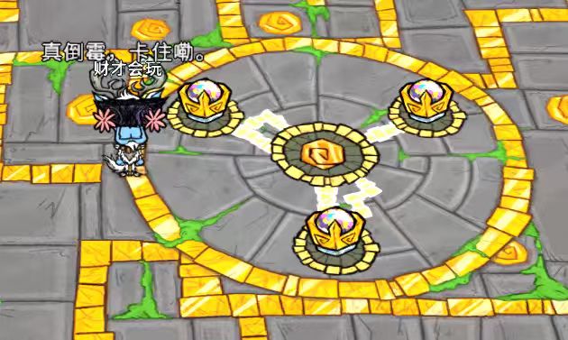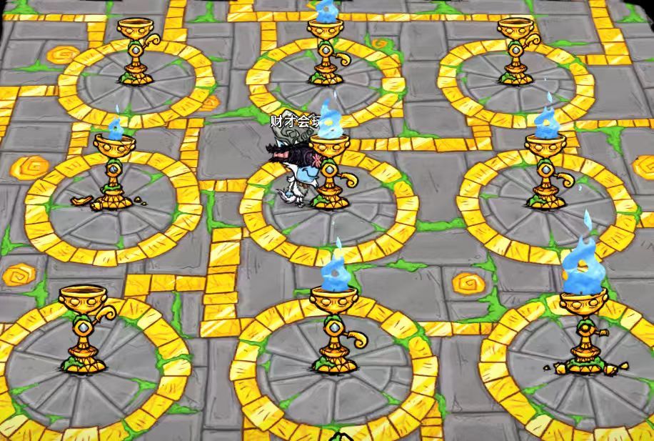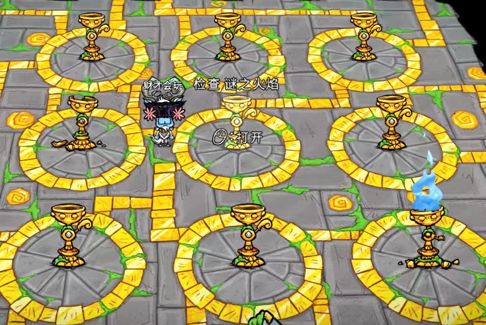 在該房間,9 個謎之火焰呈 3×3 分佈。玩家可以右鍵打開或關閉謎之火焰,並同步打開或關閉其四個方向上相鄰的謎之火焰。