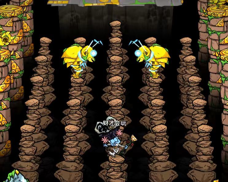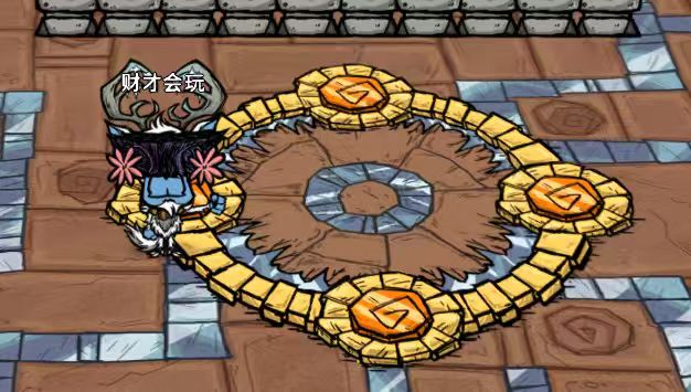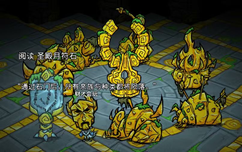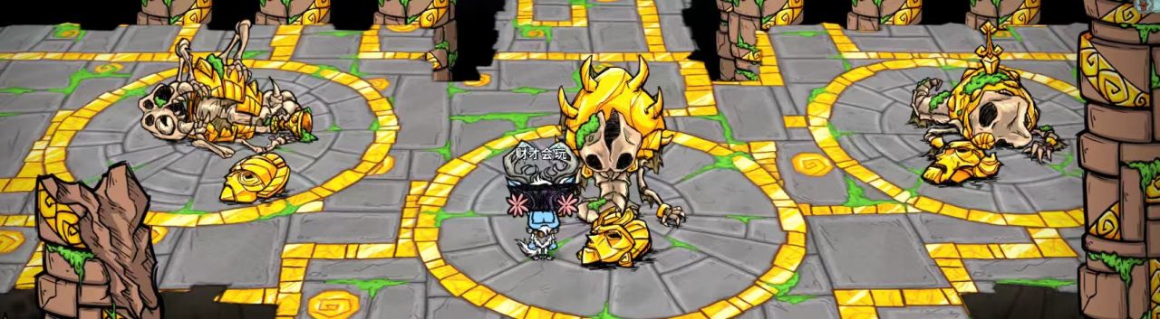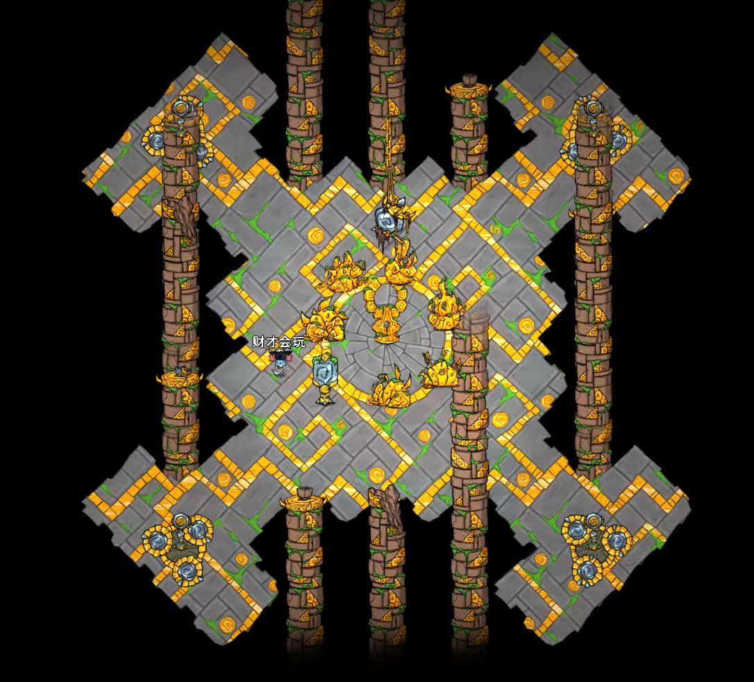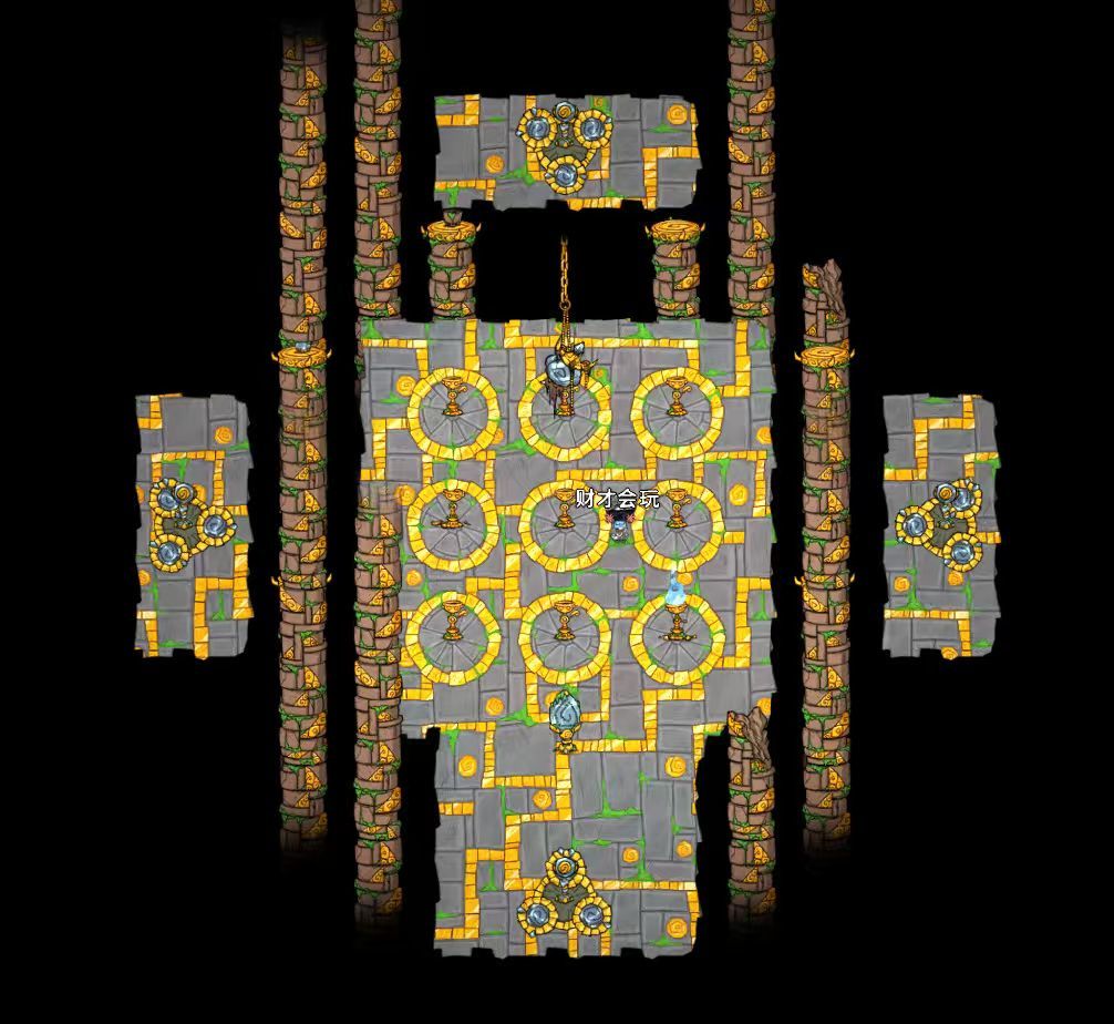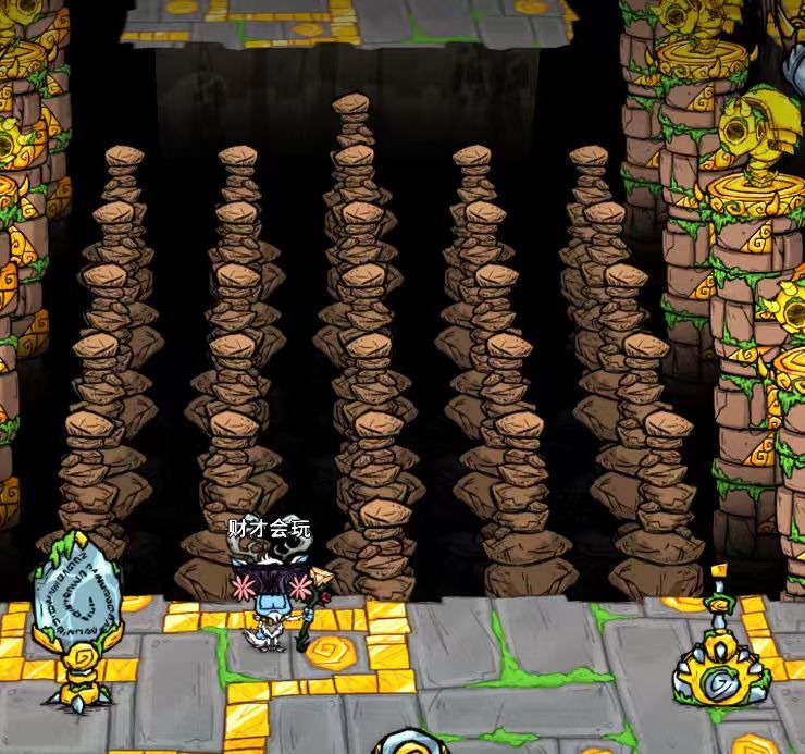 全部的 9 個謎之火焰都處於打開狀態後,聖殿石柱會在房間除了來路的三個方向生成,每個方向生成兩個,用於允許玩家經過。