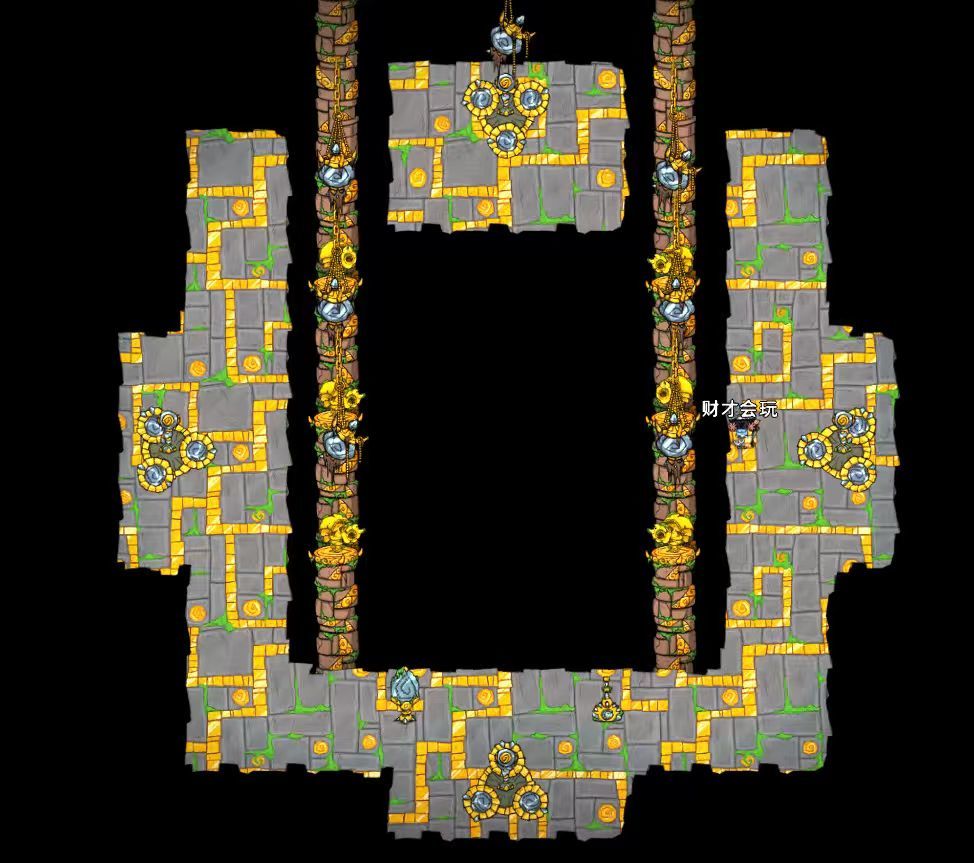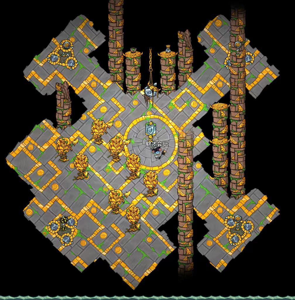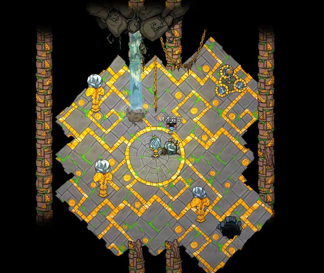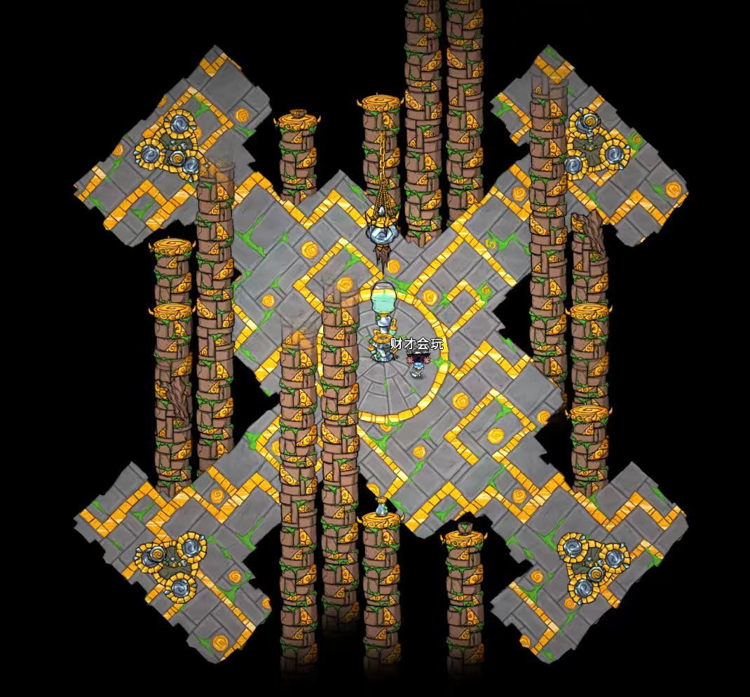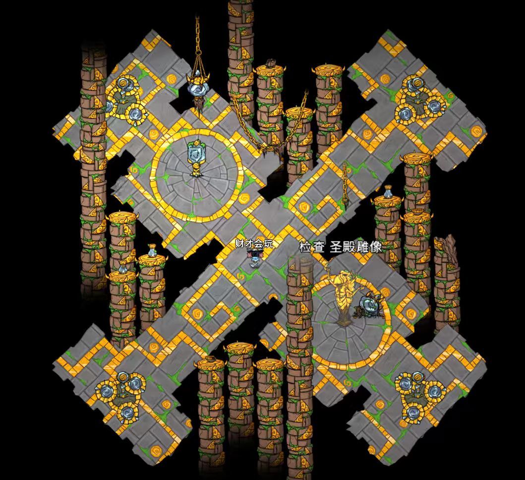 遠古聖殿的跳石柱解密房間,沒啓動前左右兩側各有 3 根巨大的石柱和 3 個聖殿華燈,每根石柱上都站立一個未被激活的追隨者。中間區域爲虛空。在最前方有一塊無法直接到達的小塊陸地。