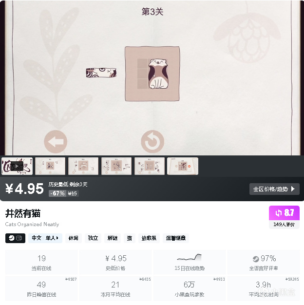 把你的貓友們整齊的放入方格中。“整貓宮”有80個精緻的關卡和一大堆不同形狀的貓咪們。