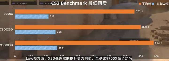 同樣得益於架構、工藝的優化,9800X3D的發熱功耗比7800X3D更低、也就支持更高頻率和超頻!綜合遊戲性能就更強: