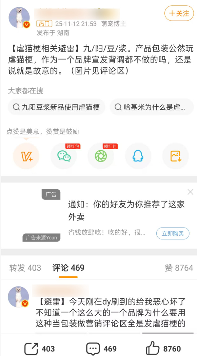 與此同時,作爲一個風評頗有爭議的網梗,哈基米南北綠豆漿的上市也在輿論場上引發了風暴,九陽豆漿的微博、小紅書等社媒下方聚集了大量認爲“哈基米”梗涉嫌“虐貓”的網民團體,對這一行爲進行痛斥——此情此景,與當年品客薯片因發佈“耄耋薯片”視頻而被圍攻的景象,如出一轍。