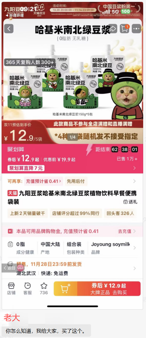 “哈基米豆漿”全稱“九陽豆漿哈基米南北綠豆漿植物飲料早餐便攜袋裝”,於今年雙十一上架九陽豆漿官方天貓旗艦店,現在預訂最晚12月28日發貨——其官方於小紅書上發佈的海報上赫然寫着“曼波上新”“哈呀庫曼波好喝”,還給封面上的圓頭貓起了個“豆基米”的名字。