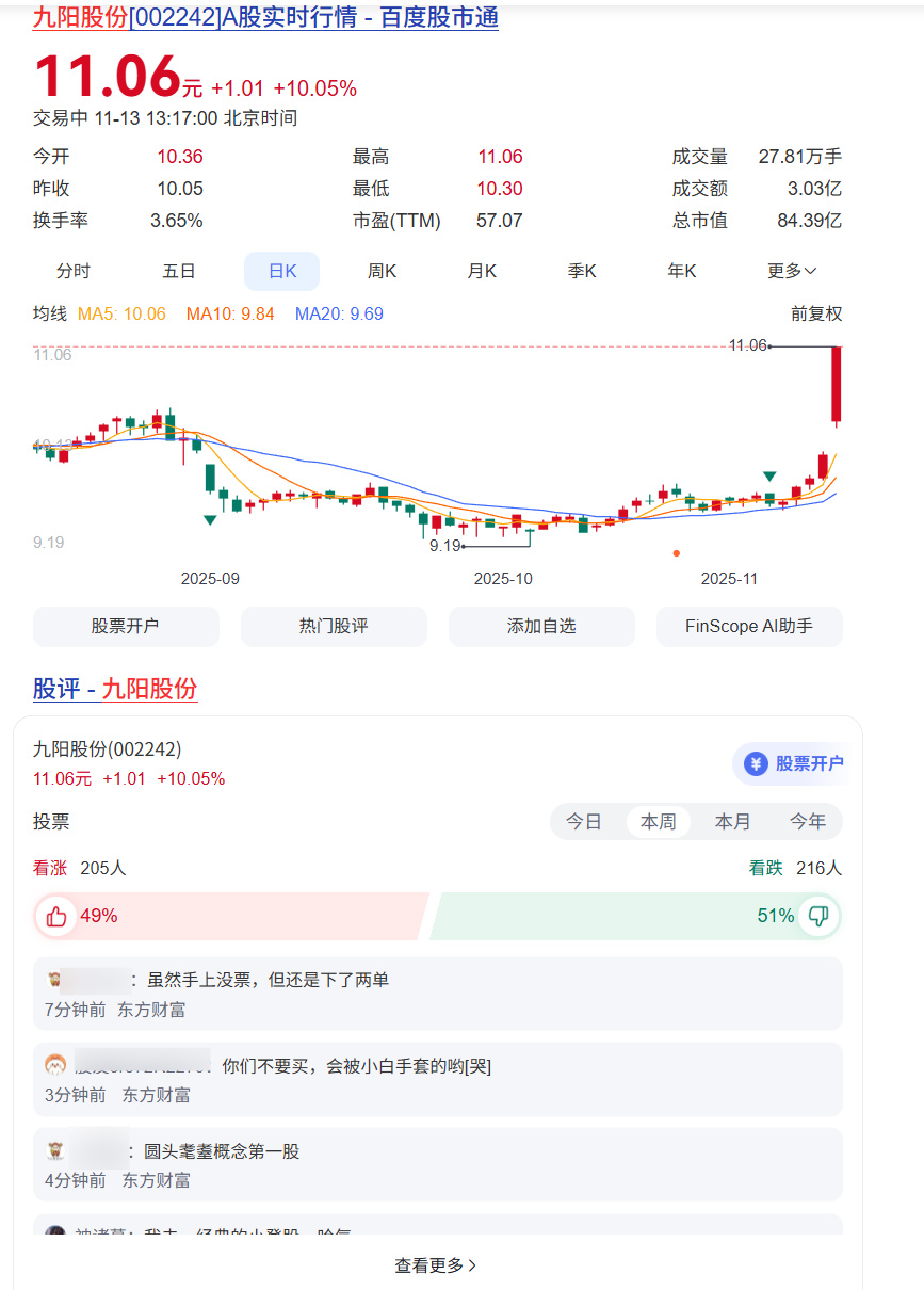 在微博“炎上”的同時,九陽股份的股價已然迎來了今年以來的首次漲停。這其中固然有一部分九陽於10月底發佈Q3財報,實現扭虧爲盈的影響,但在財報發佈的第二個交易日,九陽的股價也僅漲0.9%,遠不能和今日的盛況相提並論——說這是市場上首個哈基米概念股問世,也不爲過。