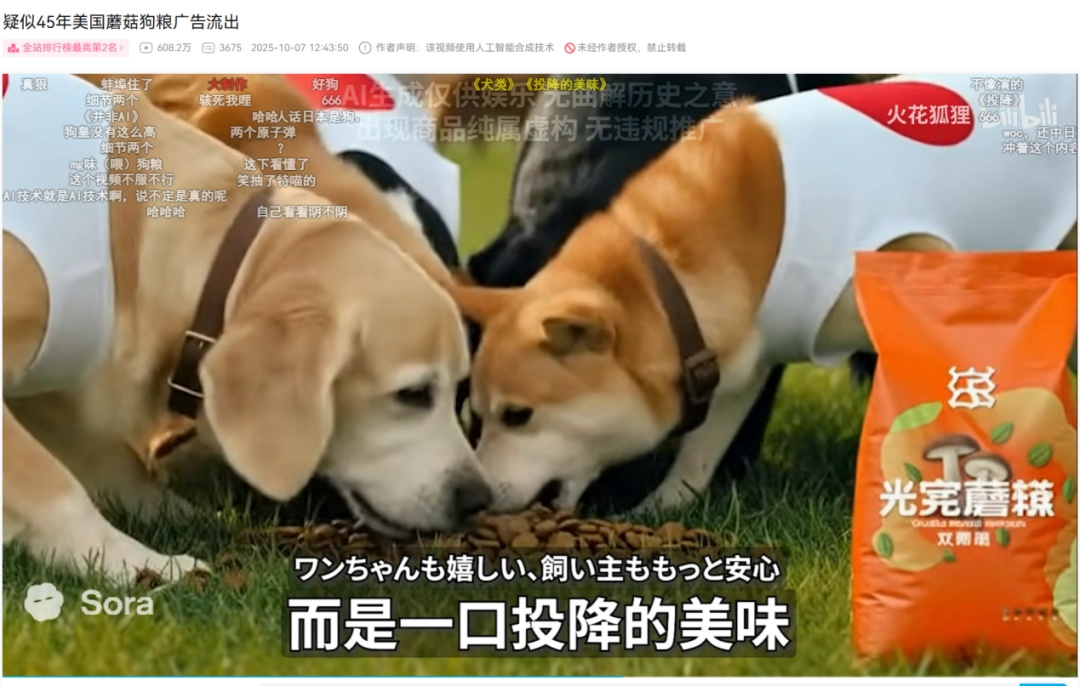 可能是由於訓練素材裏包含了過多的廣告,Sora2生成的廣告視頻幾乎稱得上栩栩如生、惟妙惟肖,誇張的角色表情動作不輸地方衛視的大路貨,能夠完全自由發揮的臺詞分鏡和幾乎沒有的創作門檻,更是充分刺激了當代國內網民過剩的創作欲——一時間,天下英雄如過江之鯽。