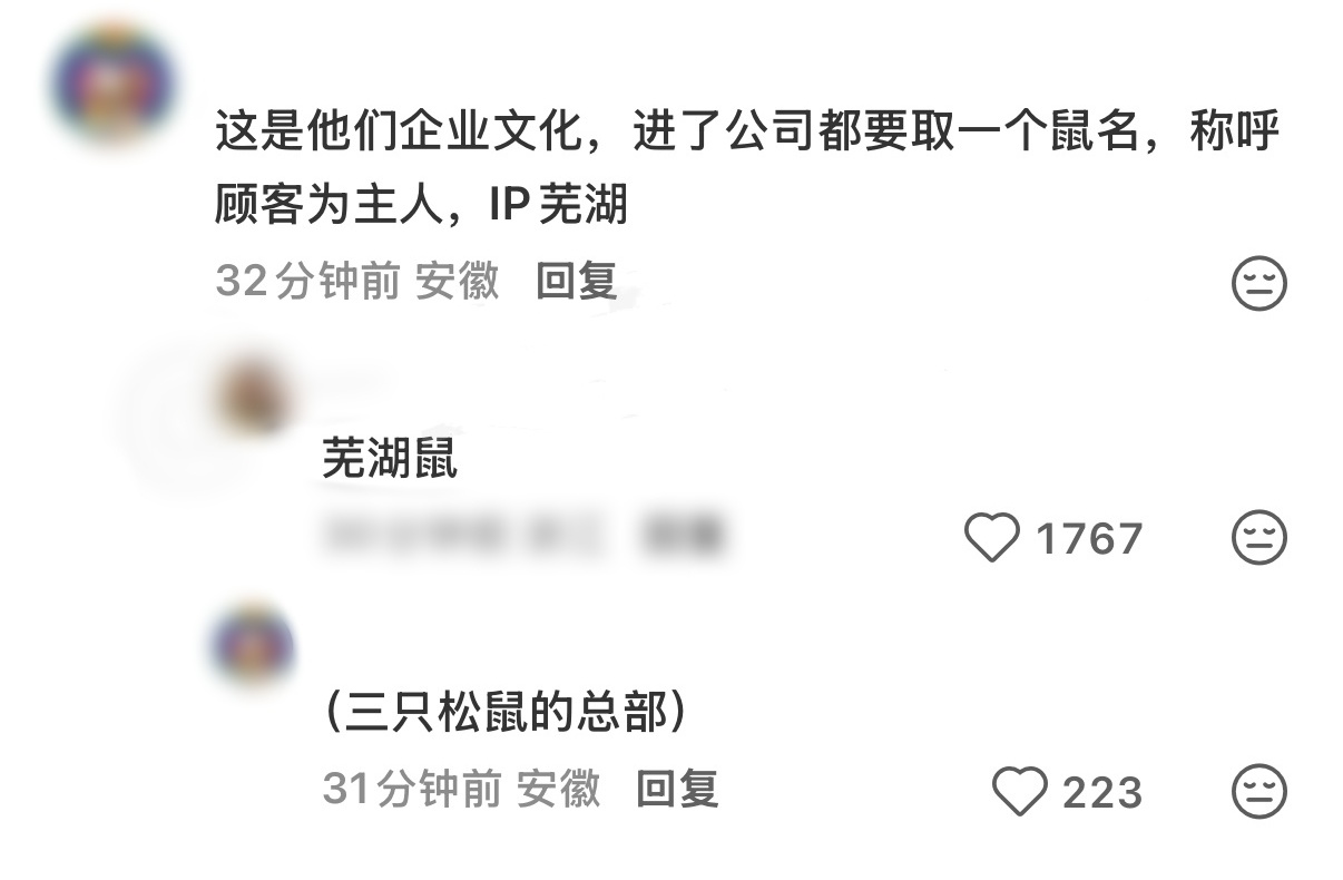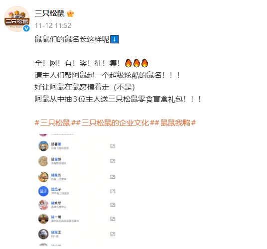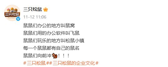 不僅如此,三隻松鼠官方還親自發文解釋道:鼠鼠們辦公的地方叫鼠窩,鼠鼠們用的辦公軟件叫飛鼠,鼠鼠們玩樂的地方叫松鼠小鎮,每一個鼠鼠都有自己的鼠名。