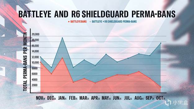 我们的团队已锁定多名高知名度作弊软件制作者,相关措施初见成效。在近期更新后,R6 ShieldGuard永久封禁了1500名使用高知名度外挂的玩家,此外还有约2000 名使用某款臭名昭著外挂的玩家被永久封禁。
