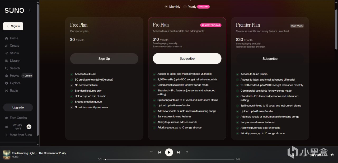 付费方式有2种,一个是每个月10美金,可以生成500首歌,还有一个是每个月30美金,可以生成2000首歌,连续包月可以节约20%。其实也可以不用付费的,每天会送50积分,可以生成10首歌,如果大家只是玩玩完全足够了,特别是给自己的另一半写一首歌,就很浪漫。( 但是要注意了,没有开通会员的话生成的歌曲是没有版权的,所以想生成属于自己版权的,就需要开通一下会员了。)