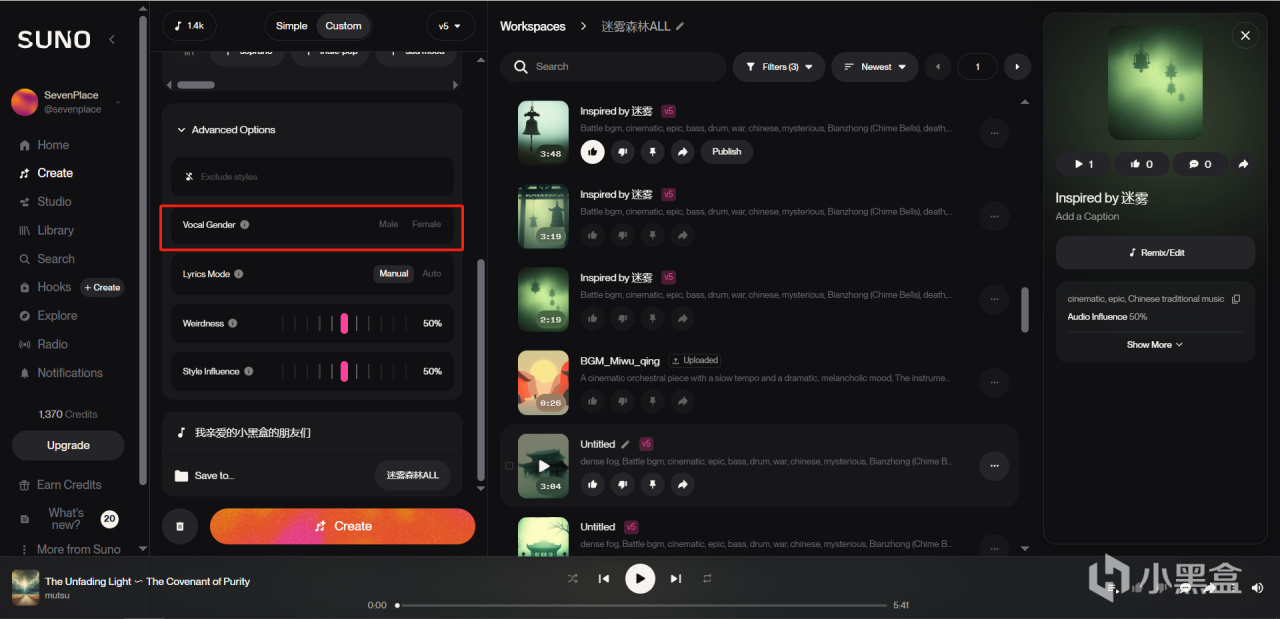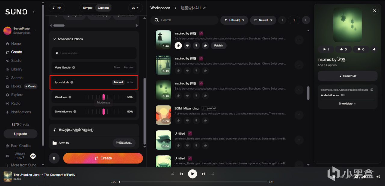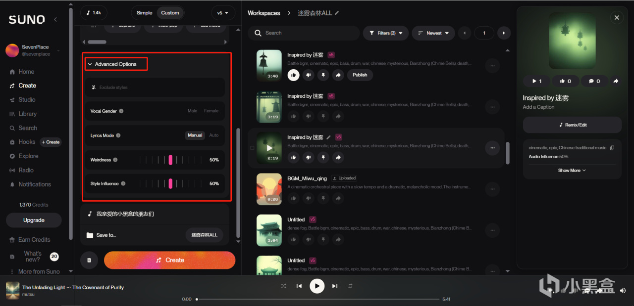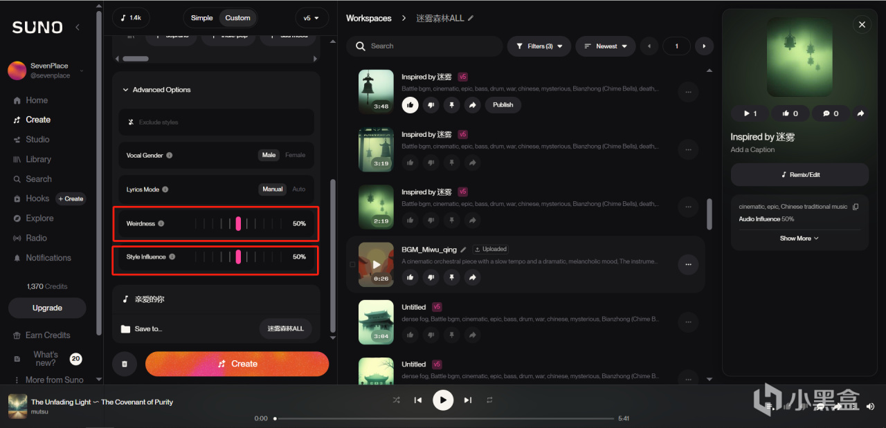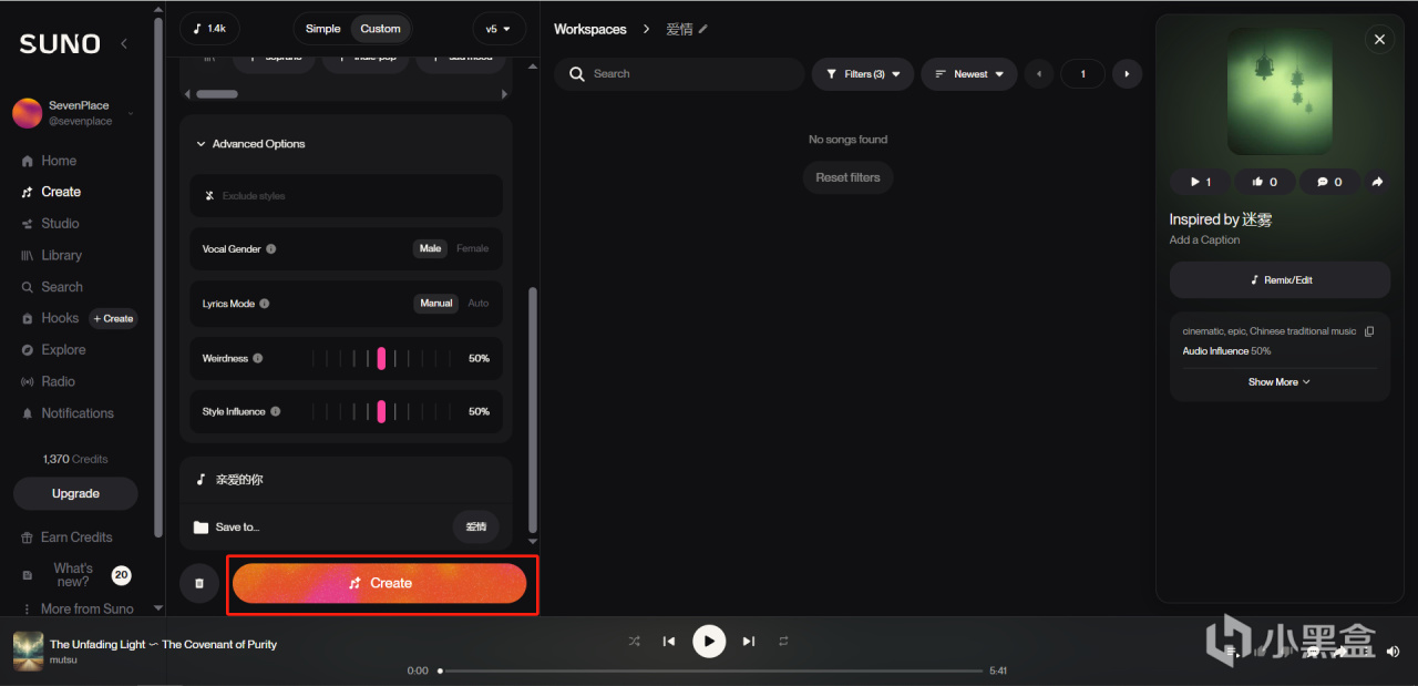 下面两个带百分比的就是“Weirdness”怪异程度和“Style lnfluence”风格影响,这个一般50%开始,如果越想歌曲保持和关键词差不多的感觉,就把这两个都调高一点,如果想AI多一点自己的发挥,就可以调第一点。一般50%给AI一点自由度还是可以的。