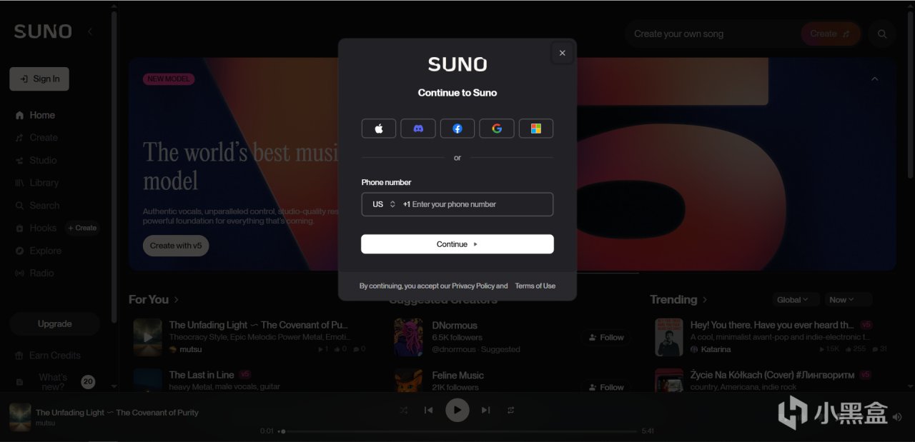 大家可以自己注册一个账号,每个账号每天有50的积分,一次生成两首歌消耗10个积分,也就是说每天可以生成10首歌,建议用苹果或者谷歌等账号直接登录,否则注册需要用国外手机号,这个就非常麻烦。