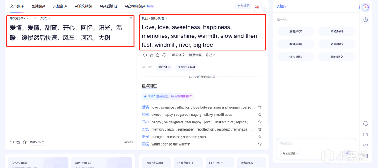 关键词最好是用英文,因为英文支持得最好,中文会理解不那么透彻,我建议就是打开百度翻译,把自己想到的词填入,然后翻译成英文再拿来用,就像这样。关键词最好是描述一些情感,这里建议把你心中你们爱情的一些关键词填入进去,比如:爱情,爱情,甜蜜,开心,回忆,阳光,温暖,缓慢然后快速,风车,河流,大树。这样歌曲里面就会有这些感觉。当然你可以在这里填入任何需求。