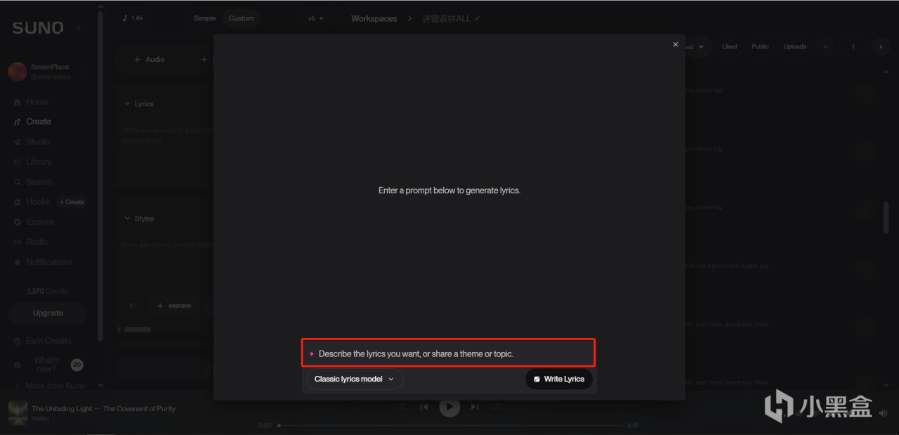 然后在新打开的面板这里填入想写的内容,这里可以填写标题,主体思想等你想表达的内容,中文就可以。填入内容后点右下角的“Write lyrics”。