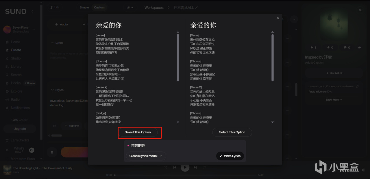 就会自动生成歌词,这些歌词在这里是不能改的, 我们选择一个自己喜欢的歌词,或者再让它生成一次也可以。歌词内容待会还可以修改的,大概差不多后,点击“Select This Option”就可以完成歌词了。我们选择左边这个歌词。