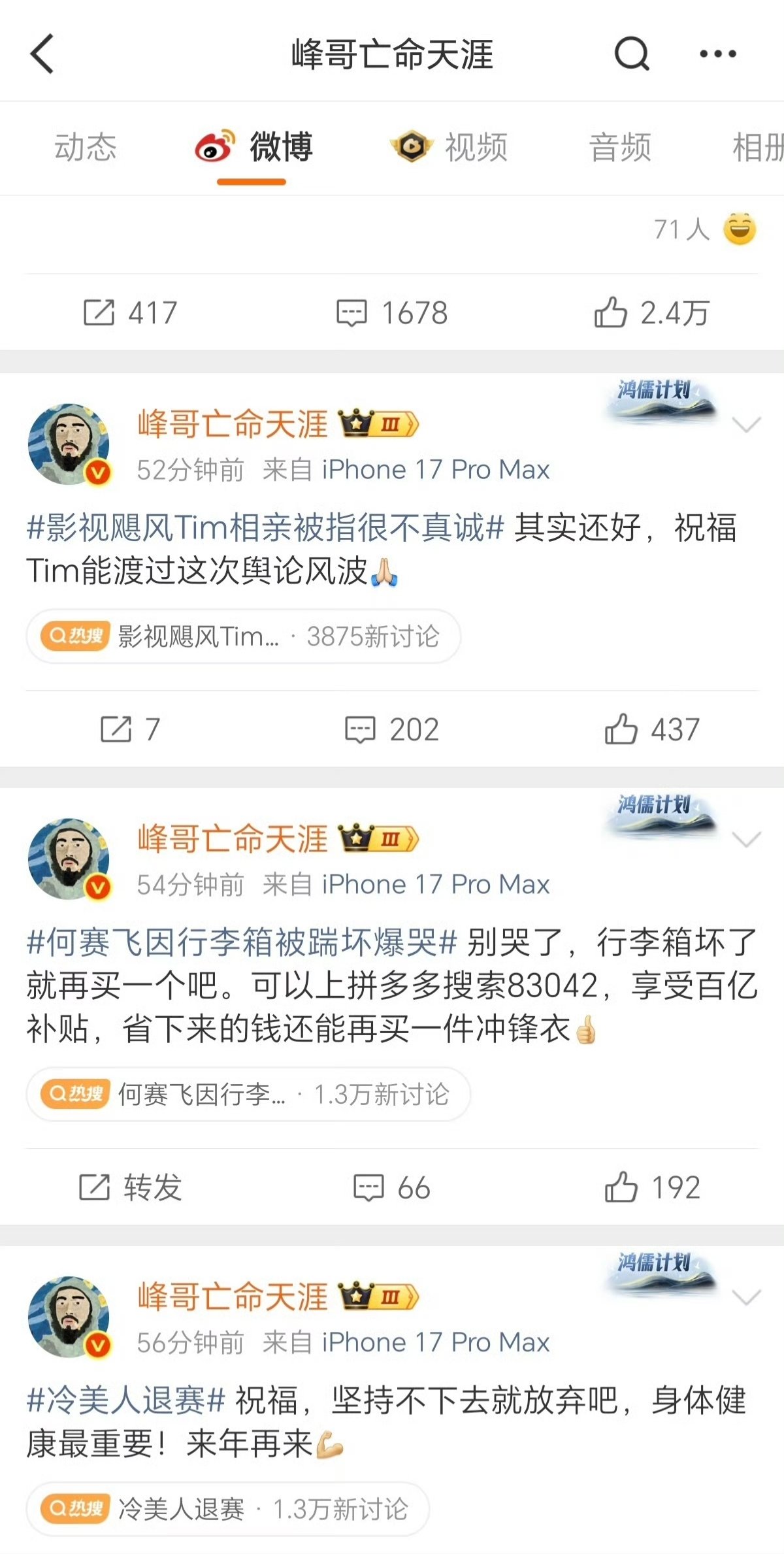 封禁动作于2025年11月14日集中发生,此前其账号处于活跃状态。封禁前3小时内,他曾在微博密集发布多条与当日热搜相关的内容(如评论影视飓风Tim、何赛飞行李箱事件等),被网友推测为“回光返照式操作”。