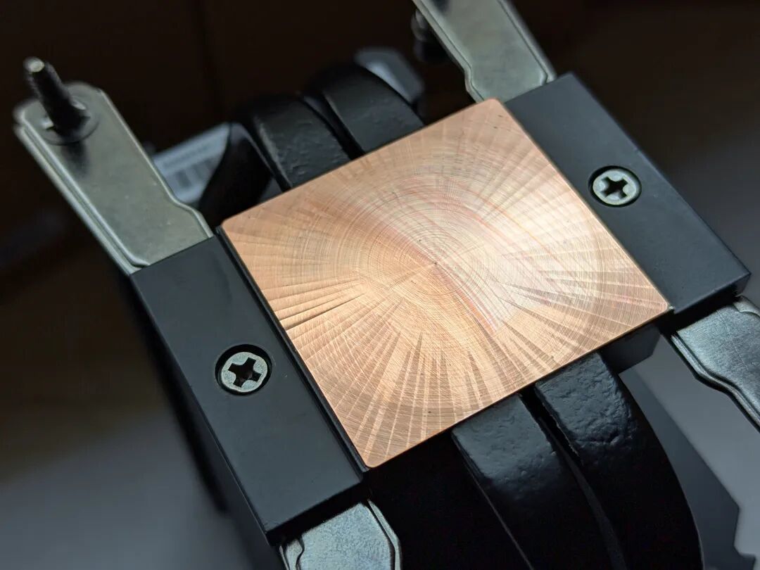 两侧的热管呈常见的U型排列,而中间的两支则不同寻常:不再沿铜底弯曲盘旋,而是径直从底座破穿而出!