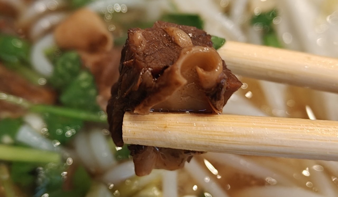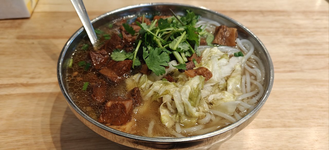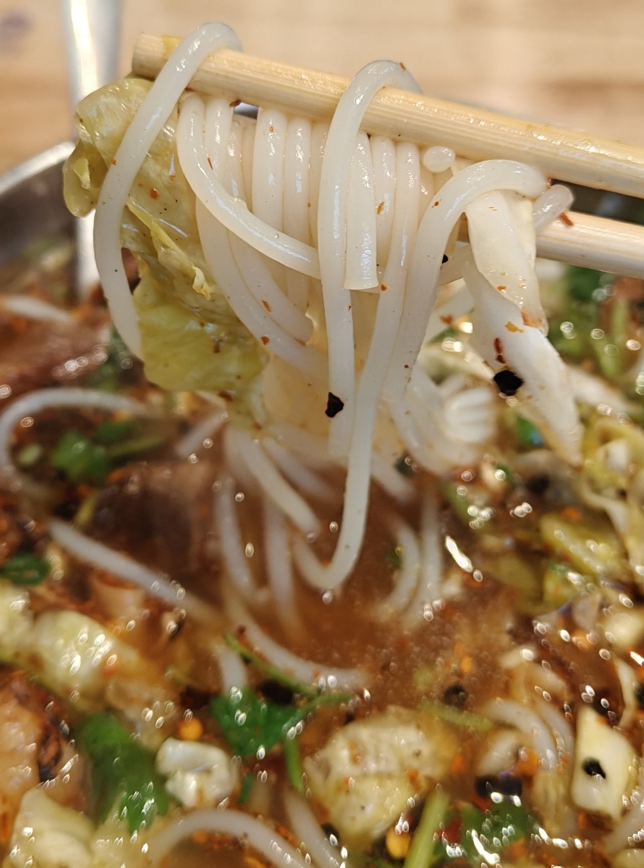一進店門就能看到門口熬着的一大鍋牛骨清湯,牛肉粉的主要風味就來自於此,湯色清而味濃,鮮味很足,湯麪上只浮着一層薄薄的油花,加上泡白菜提供的乳酸味,粉喫起來就清爽不膩。