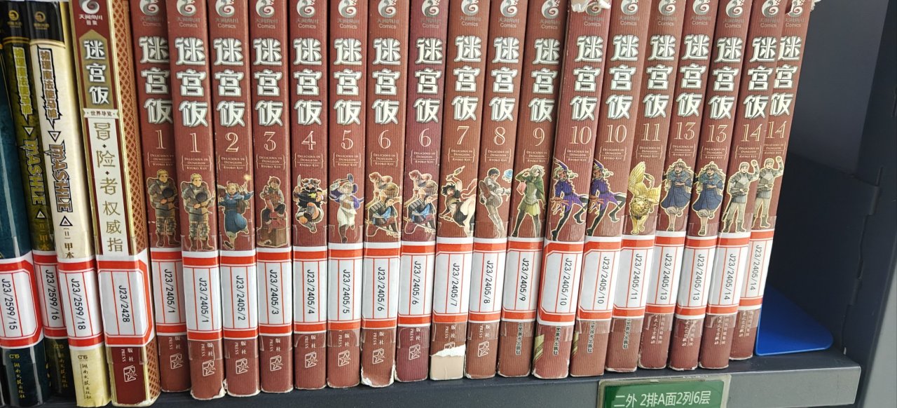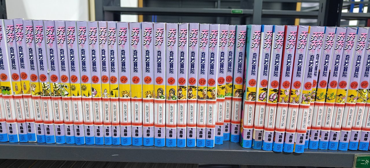 圖書館裏的漫畫編號爲J開頭,都在地下1層,出借率高的就在借閱機旁,其他的在借閱室的深處。熱門的有像是《jojo》、《鬼滅之刃》、《一拳超人》等等。
