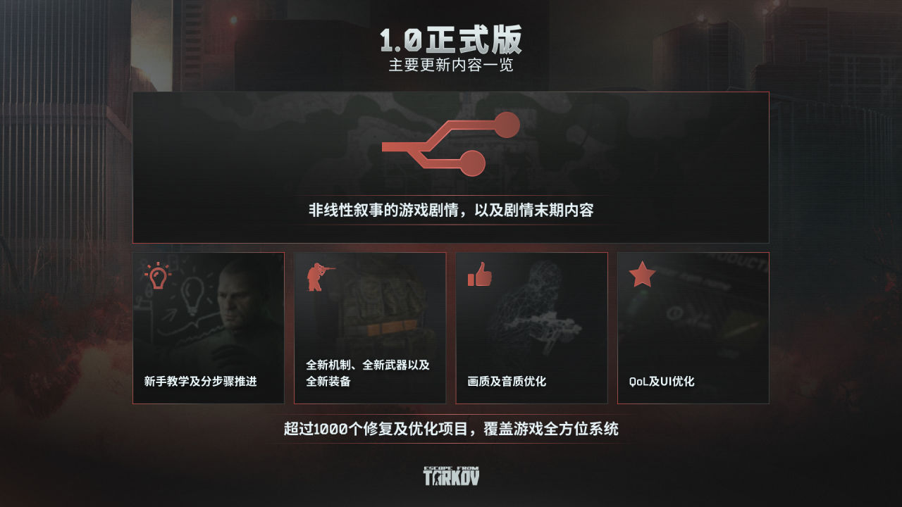 今日,《逃離塔科夫》發佈 1.0 版本更新日誌,併爲《逃離塔科夫:競技場》推送了 0.4.0.5 版本更新。此次大規模更新標誌着遊戲結束長久的測試階段,爲玩家帶來全新體驗。