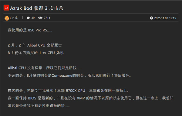 雖然其它主板也偶有類似案例,但華擎主板絕對是銳龍7000/9000系列CPU的頭號“殺手”。