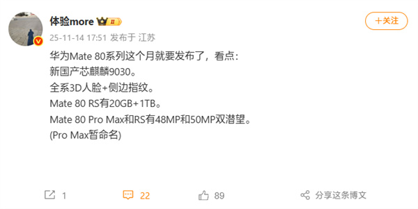 有望首发麒麟9030旗舰处理器,顶配的Mate 80 RS会提供20GB+1TB版本,其中20GB内存是国产定制方案,行业唯一。