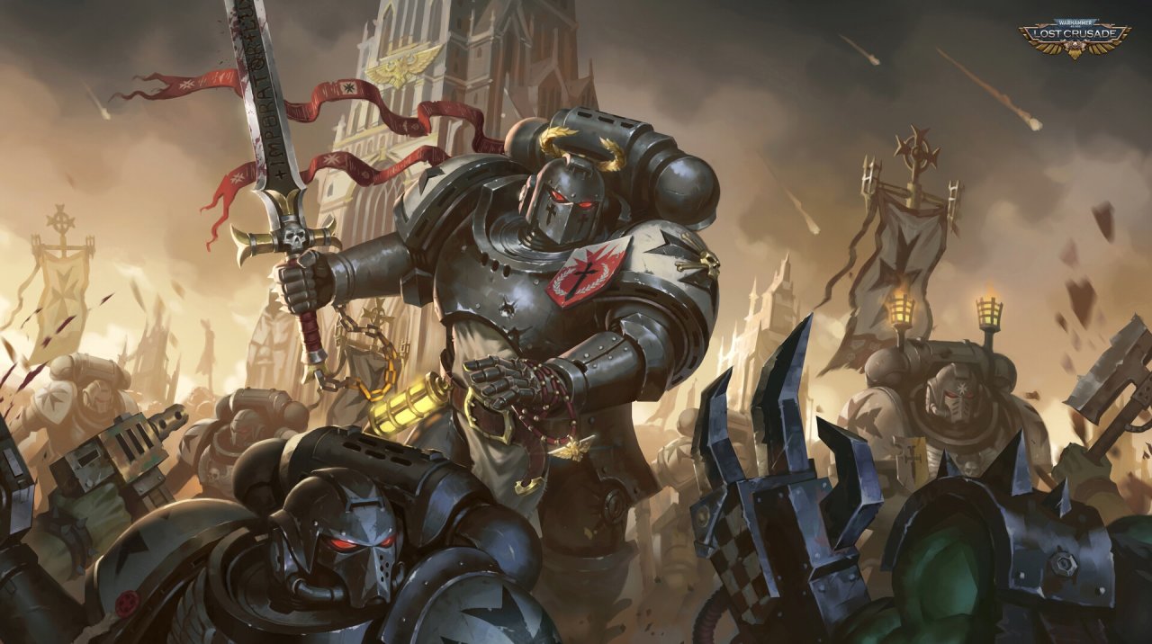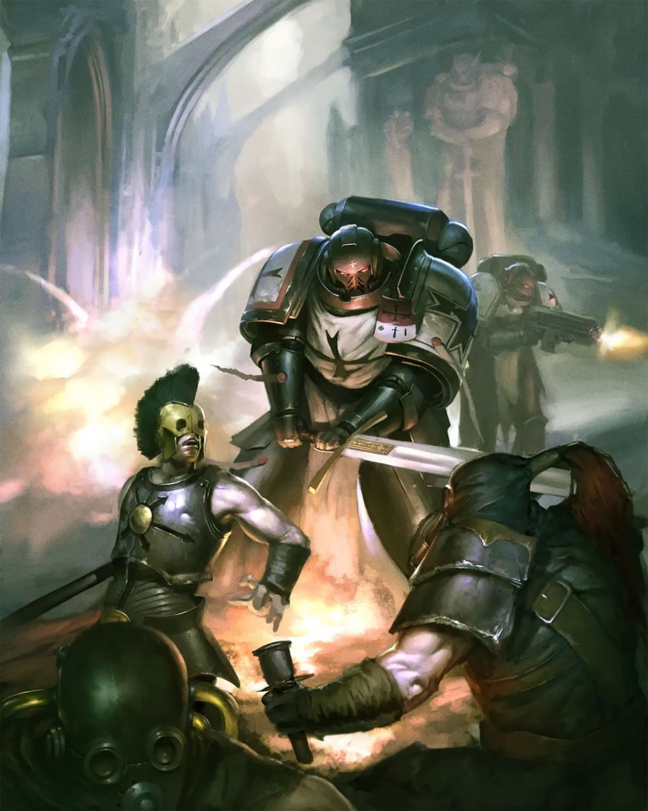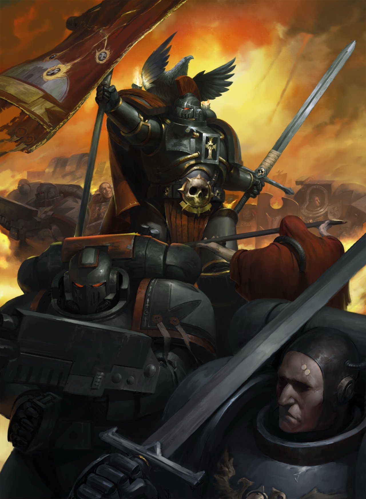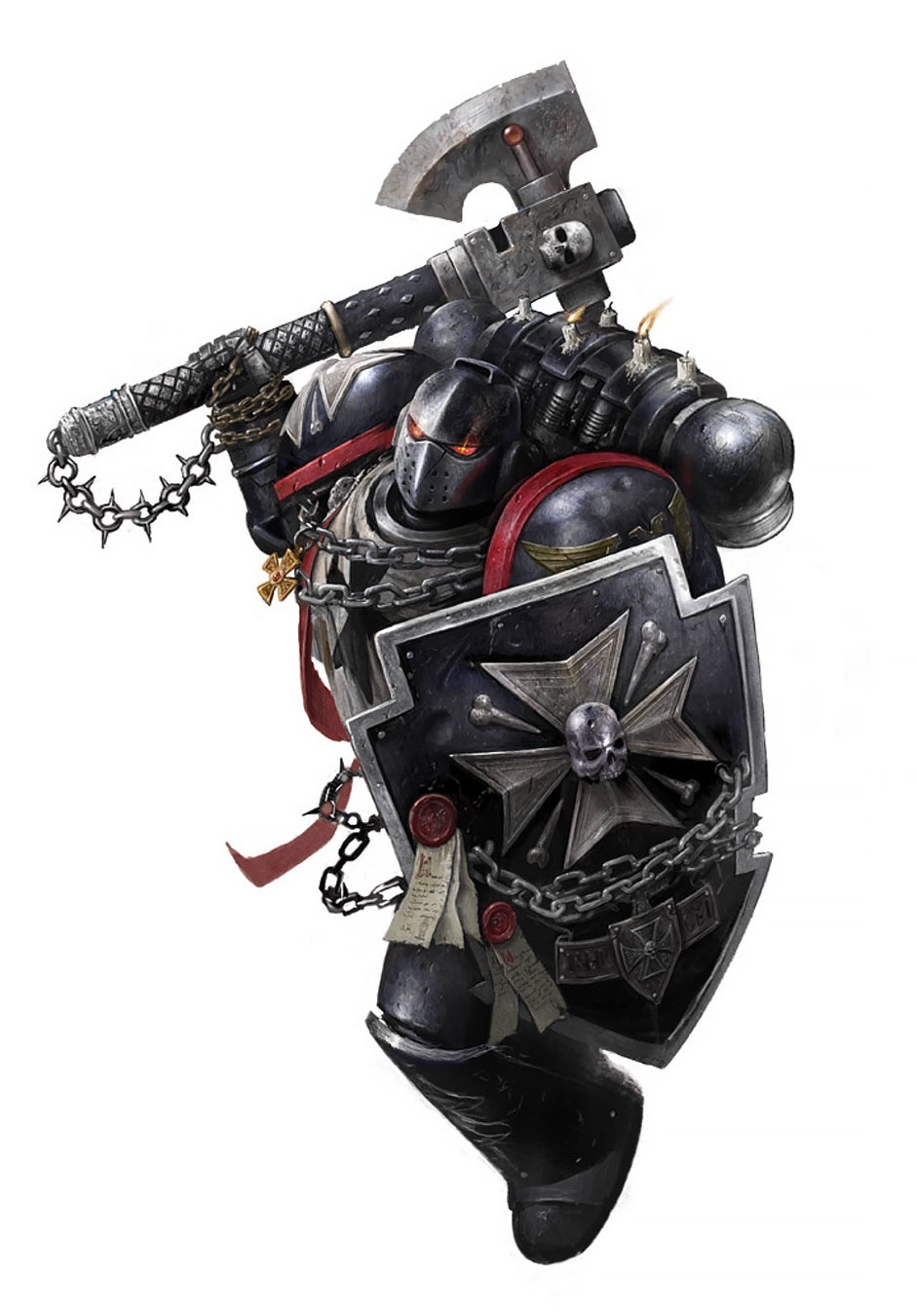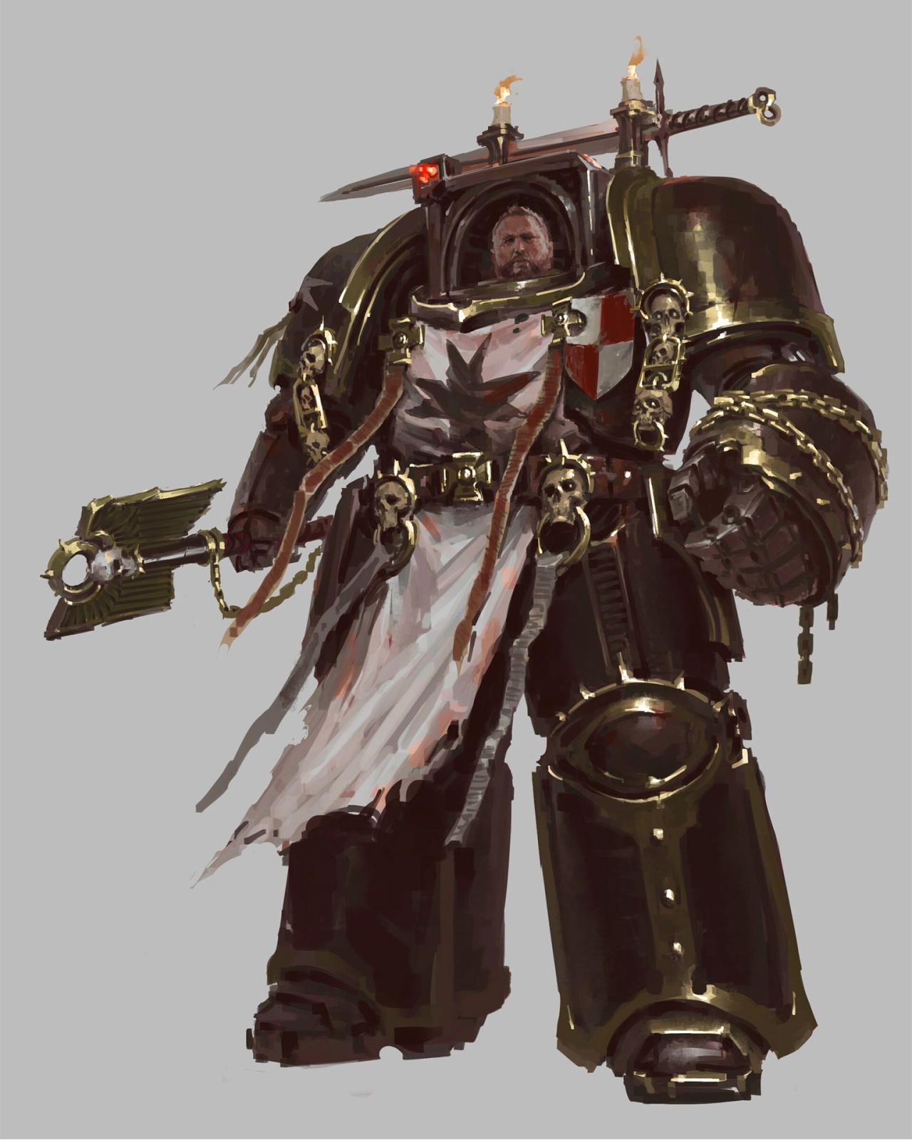强调对异端、异形与灵能者的绝对敌意。 视觉上,黑色圣堂以黑色动力甲、白色肩甲与披风、白色八角十字徽记为标志,装饰大量经文卷轴、封蜡、铁链与圣物,是战锤40K阵营中宗教感和仪式感最强的一支星际战士。
