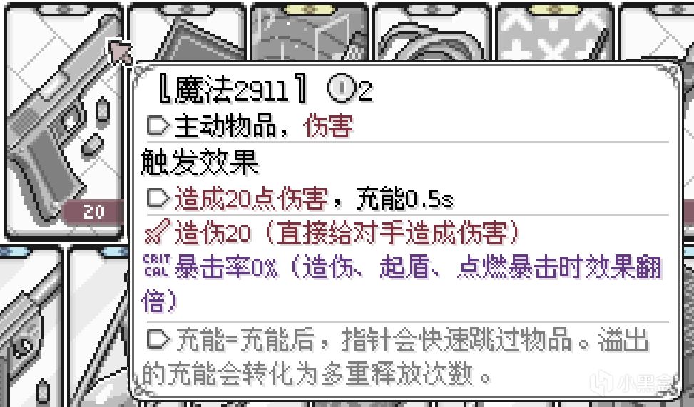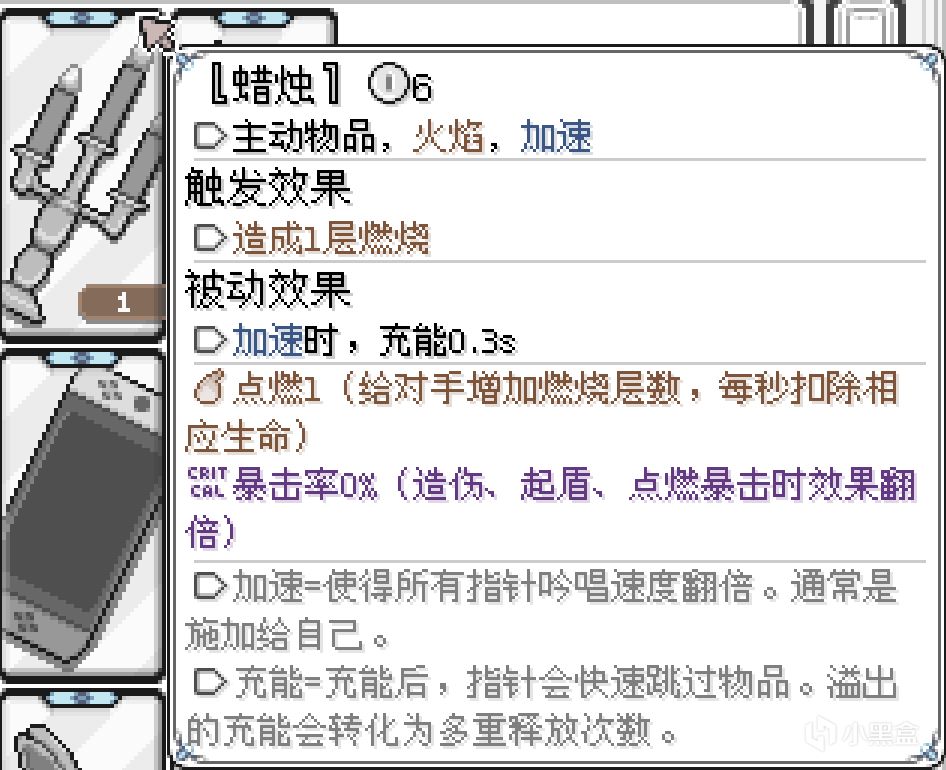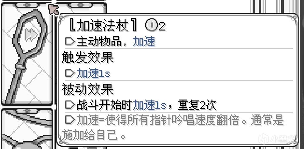1s的充能能让指针往右跳1格;而如果当一个只有一格的物品获得了两秒充能,指针依旧只会往右跳一格,但是它会一口气释放两次!