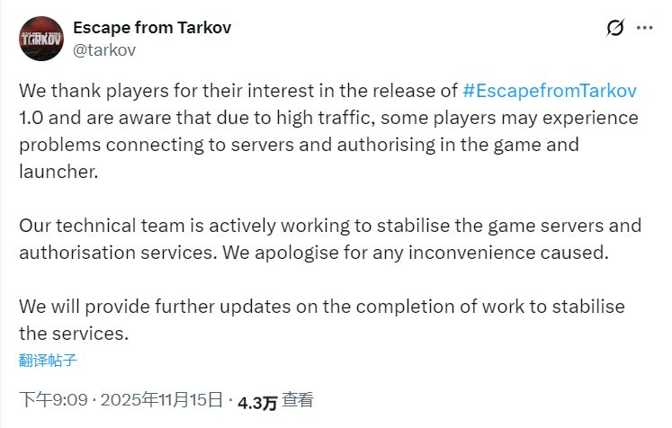 官方对此造成的不便向玩家深表抱歉,并计划服务器稳定后发布相关通告。