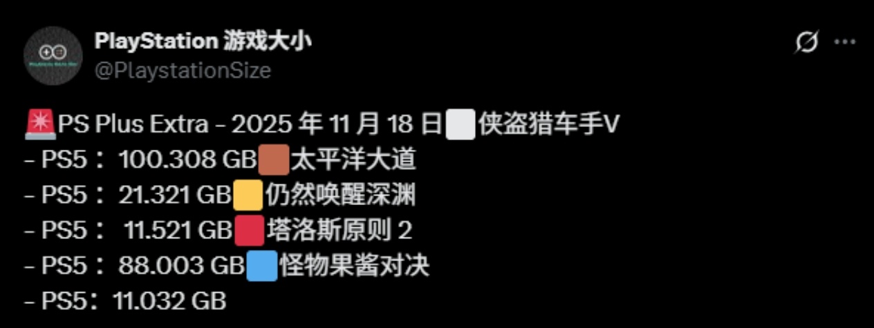 11月PS+二三档会员游戏容量大小公布,《给他爱5》以超过100GB的容量需求位居榜首。根据数据,该游戏PS5版本需要100.308GB的存储空间,是本月阵容中容量最大的游戏。