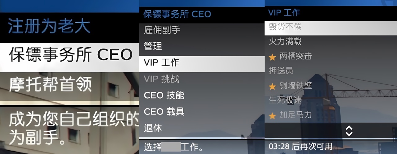 参与方式:按M打开互动菜单—注册为老大—保镖事务所CEO—VIP工作