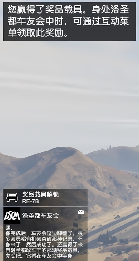 完成竞速后,在洛圣都车友会中,按M打开互动菜单,洛圣都车友会-奖品载具挑战-手动领取奖励。