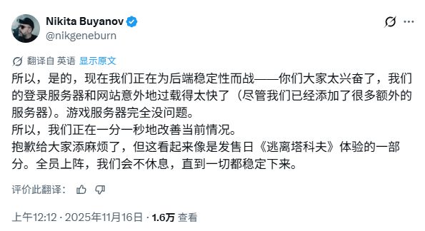 目前,尼基塔開發團隊正在全力維護後端系統的穩定,尼基塔表示儘管官方已經增設了大量服務器,但玩家的熱情遠超預期,登錄服務器和官網瞬間就被擠爆了。