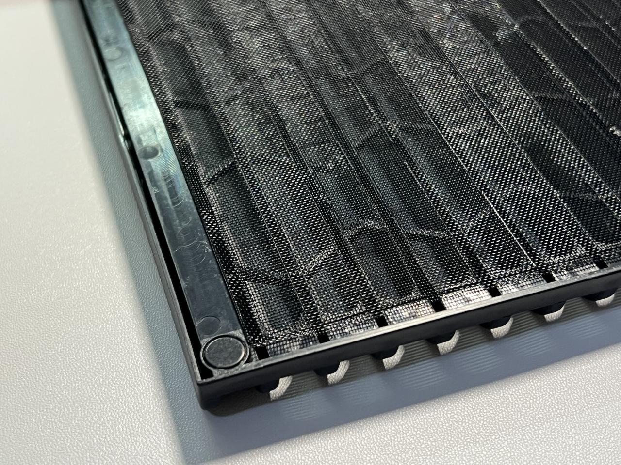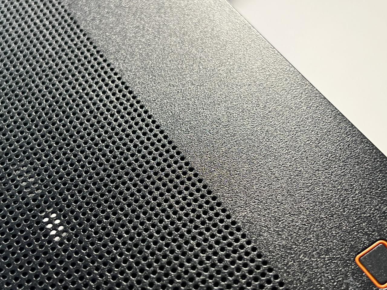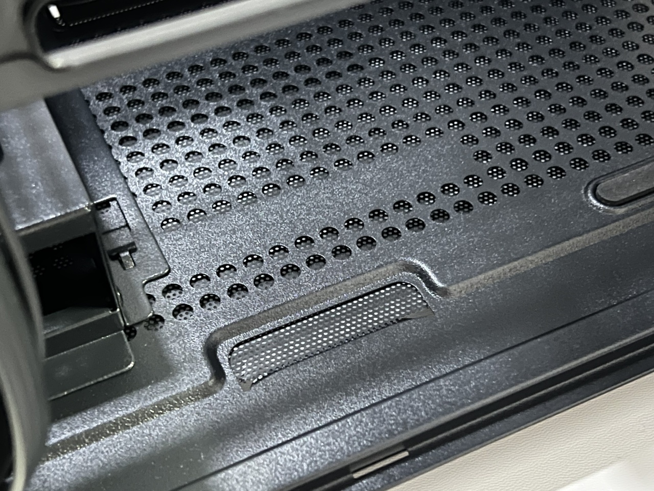 D36正面做了一个竖形的栅格设计,覆盖了一整个正面,保证了进风量,通过磁吸固定,通过卡扣固定的外框上沿是品牌标识和机箱具体型号,拿下栅格后是尼龙材质的防尘网,目数比较细,防尘效果没得说,但日常清理的频率也会相应增加。