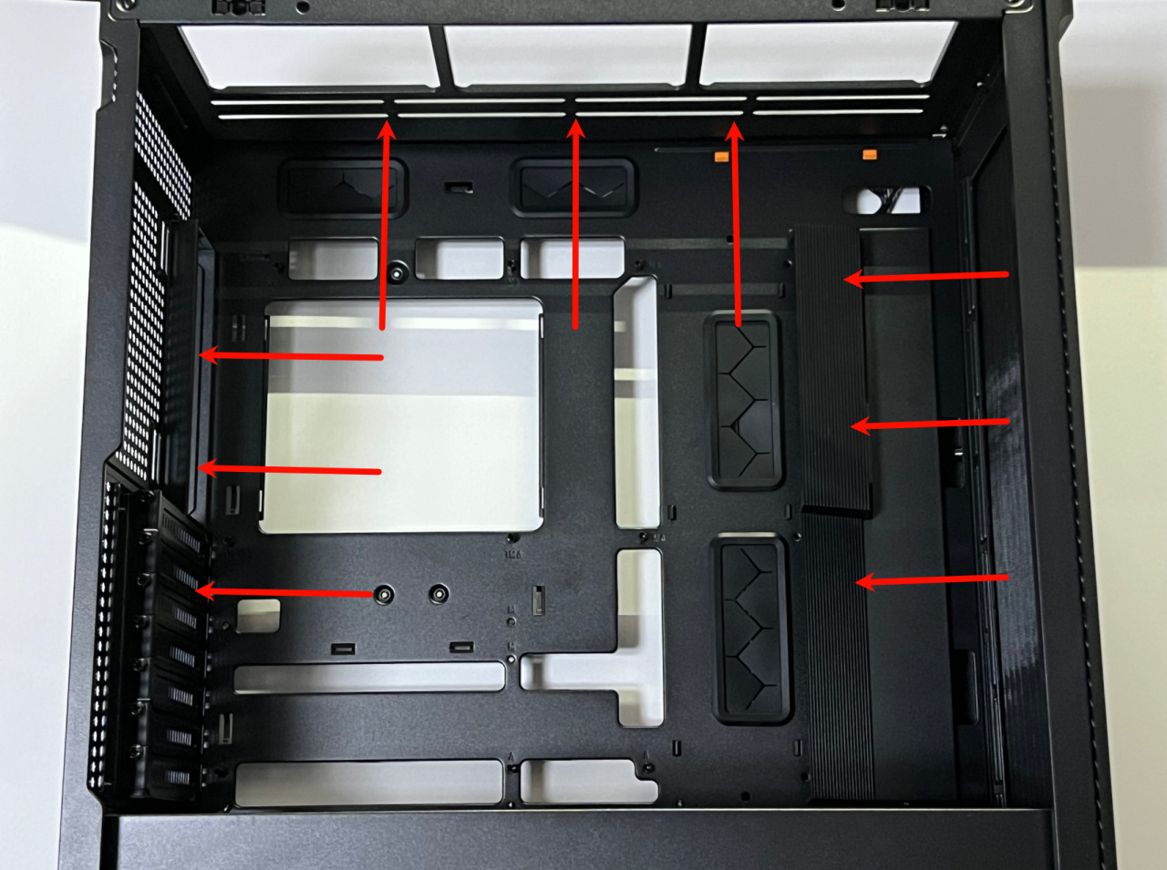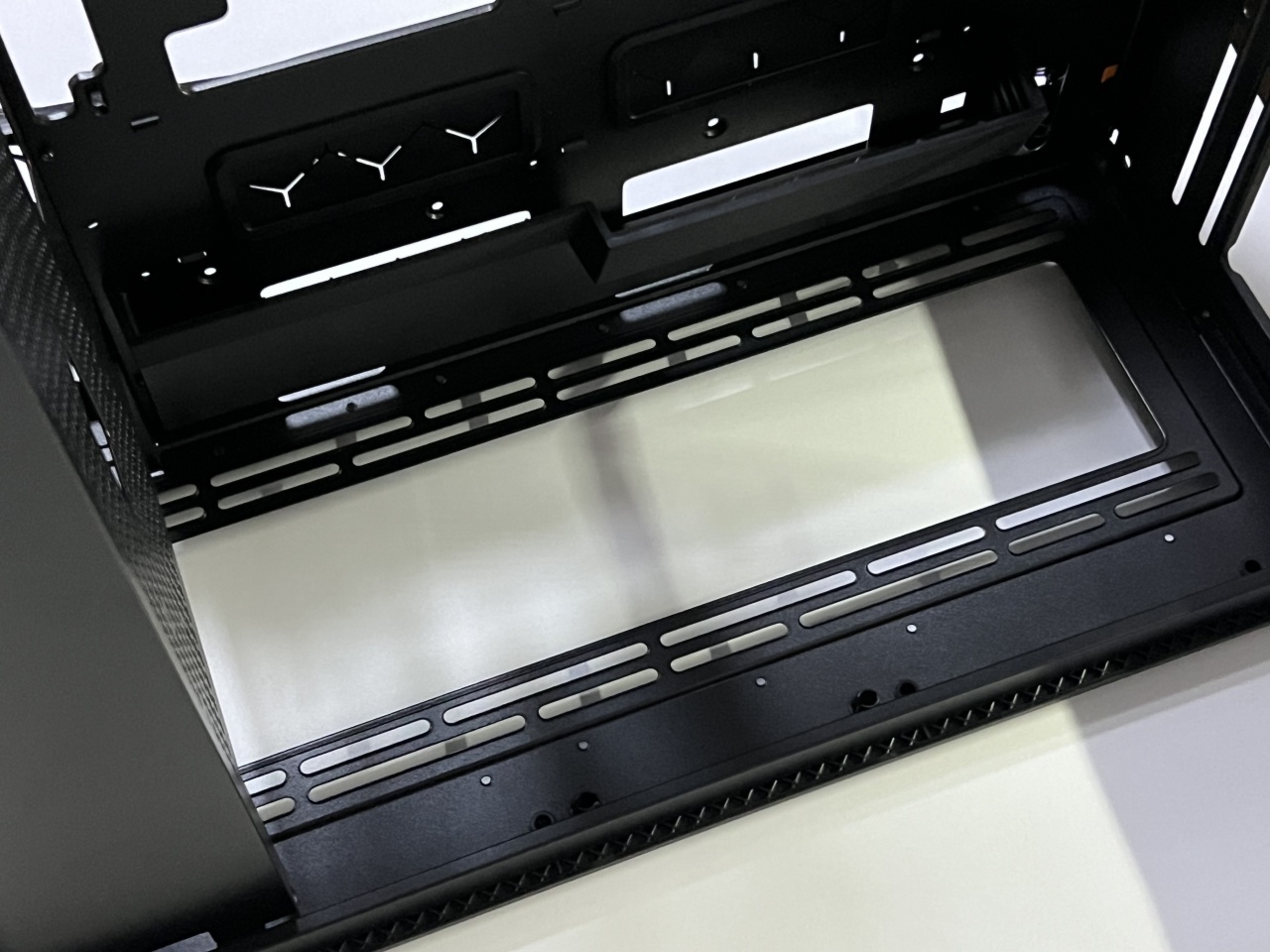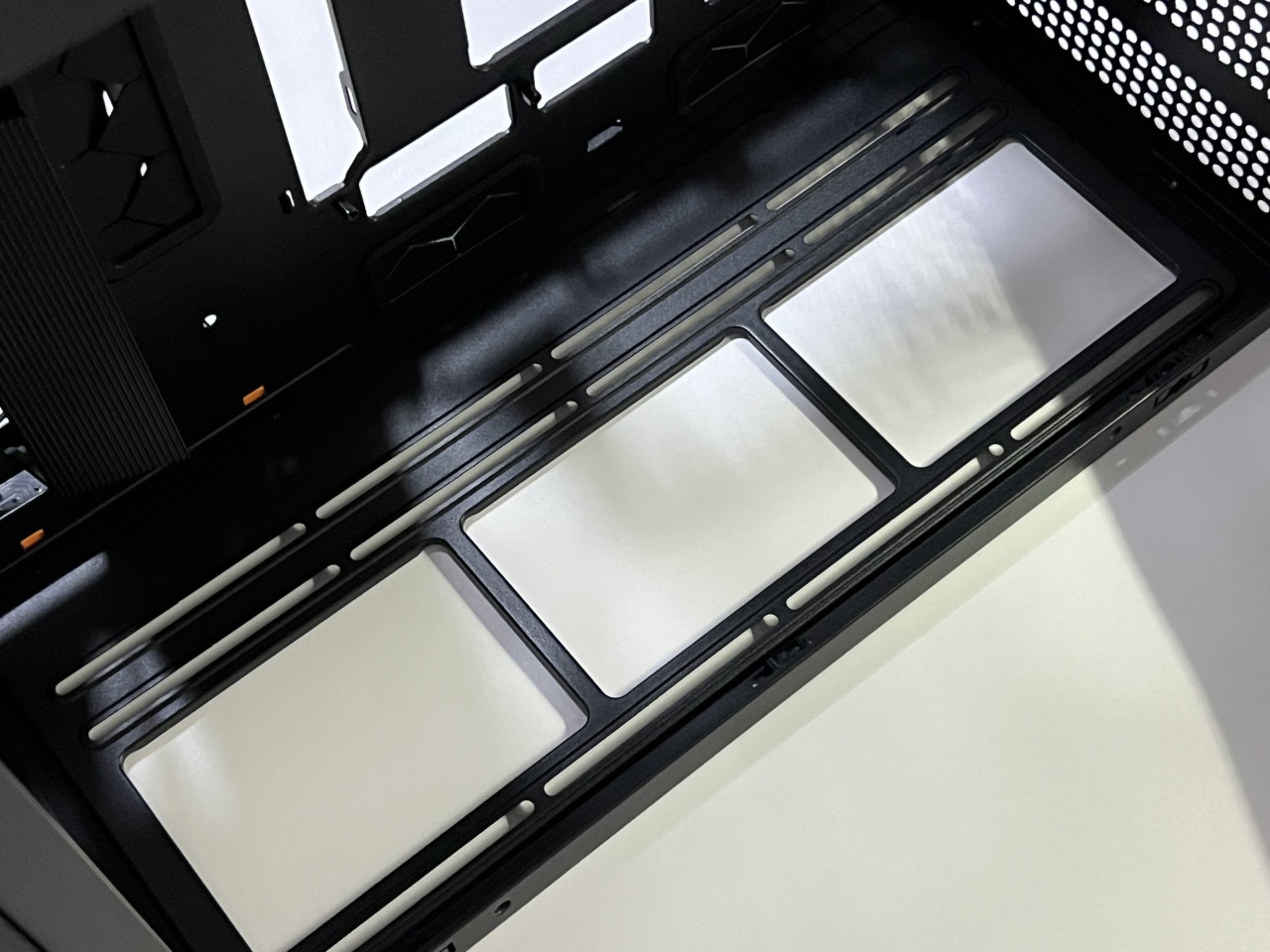 D36是前部进风,顶部和后部出风,目前主流的风道选择方案。但有个问题得注意:机箱前部磁吸面板距离太靠近风扇,过于贴近前面板风扇转速快了可能会带来啸叫问题;D36也是为了兼容120mm和140mm风扇,同时设置了4根固定条,装140mm风扇时会遮挡部分进风面,影响进风气流,算是风道设计上存在一个不足吧。