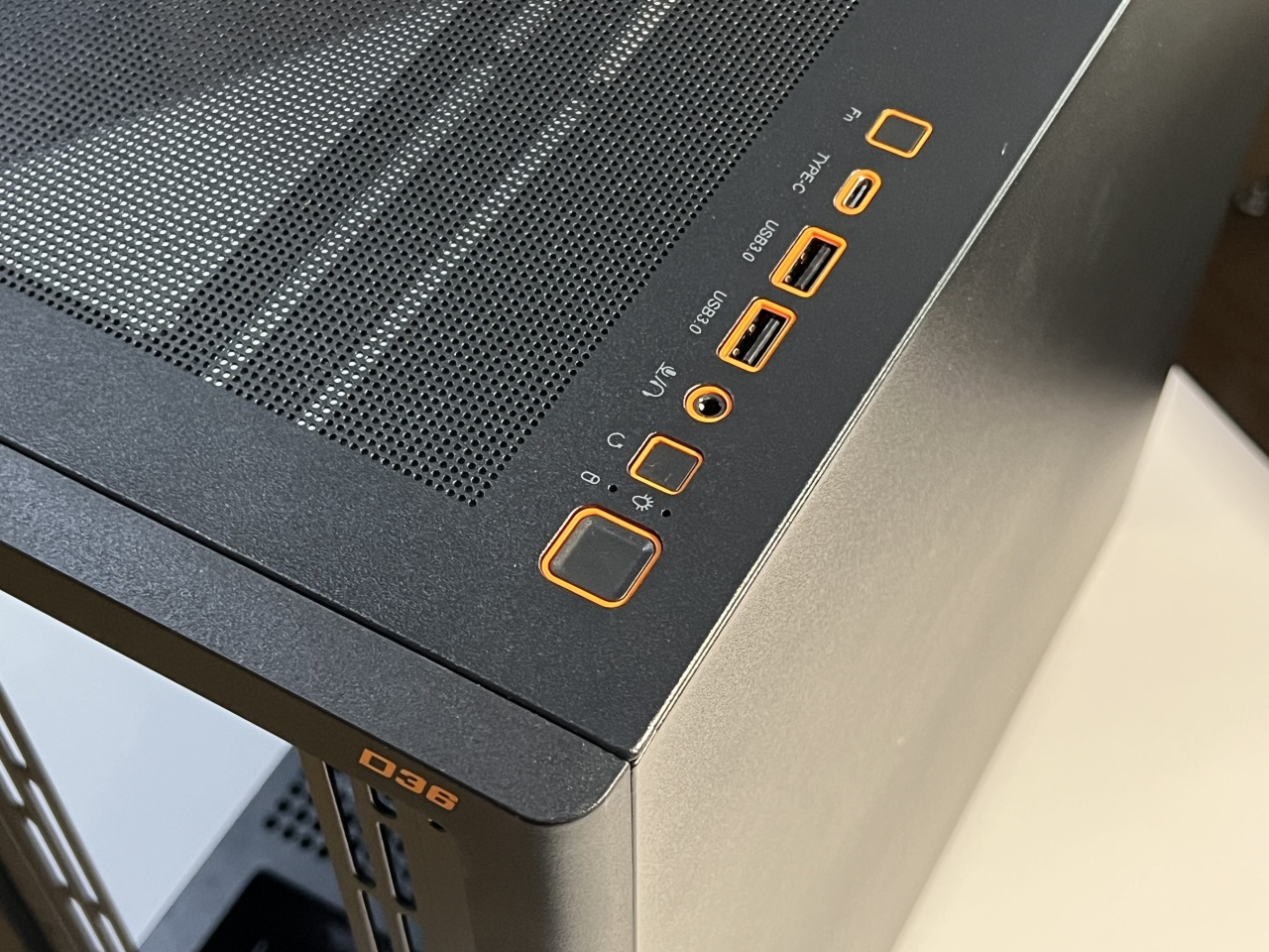 D36的顶部盖板做了冲孔的设计,能提高散热效率,IO面板接口被设计在了顶部盖板右下侧,这设计放在现在很少见了,现在的机箱尤其是海景房IO面板放在底部偏多,印象里早些年电脑会把IO接口放在正面偏上或者顶部,这么看D36其实更适合放在地上,摆在桌面上设备插USB传个数据还好,就是这音频接口插耳机的话有点不方便。