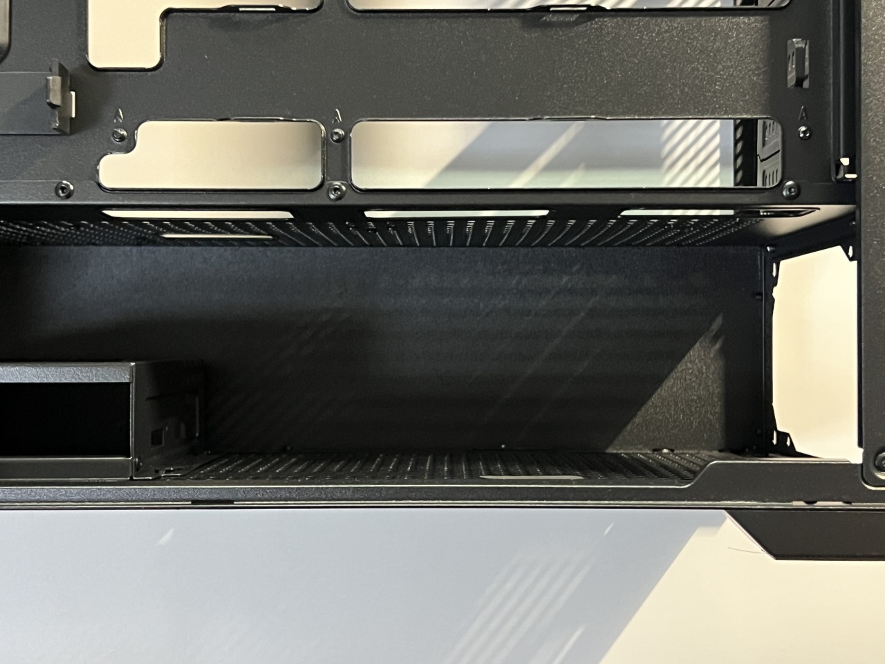 硬盘笼后面的电源空间长度大概有25cm,但只能装20cm长的电源,再往下看能看到底部的防尘网。