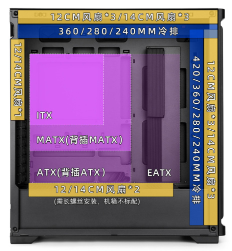 D36支持背插主板,像微星B650M这类的背插主板都能装在D36上,同时还能兼容不同规格的主板,最大支持规格330×305mm,像小的ITX、大的EATX都可以,通过移动旁边的主板遮线板进行兼容。