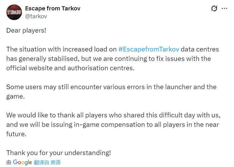 《逃离塔科夫》数据中心的负载过高问题已基本趋于稳定,但我们仍在持续修复官网及认证中心的异常状况。