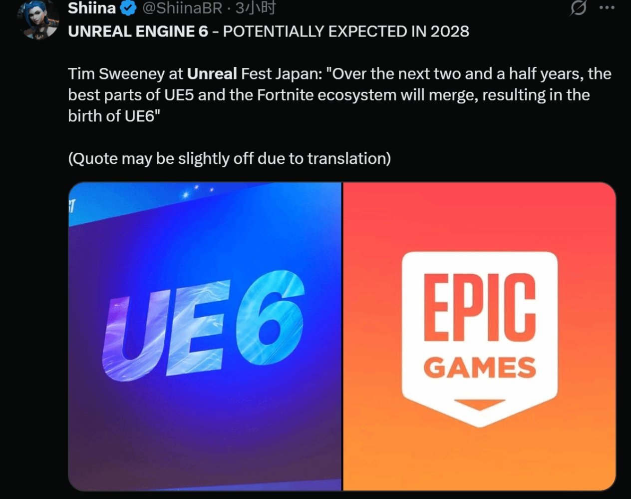 Epic Games首席執行官蒂姆·斯威尼在東京舉行的“Unreal Fest”活動上宣佈,虛幻5引擎將在未來兩年半內過渡到虛幻6。斯威尼表示“UE6將成爲融合了UE5與《堡壘之夜》生態系統精華的引擎”。