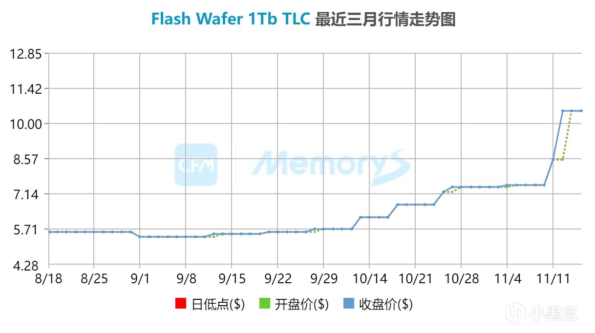 我们来看看上游供应链的数据,根据闪存市场(CFM)网站的数据曲线,从10月份开始,NAND闪存晶圆的价格就一路高歌猛进,近半个月更是呈现出陡峭的拉升。举例来说,目前1Tb TLC晶圆的售价已经达到10.5美元,较9月的价格已经翻倍。
