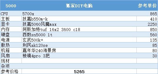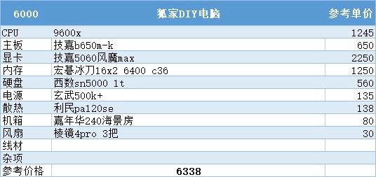 到了6000这个预算我选择上到9600x加5060,全新的am5平台使得将来升级更加方便,如果更需要显卡性能的话这套也可以换7500f加5060ti,如果预算实在紧张也可以选择将内存缩水到6000 c38,这样差不多可以做到6000出头